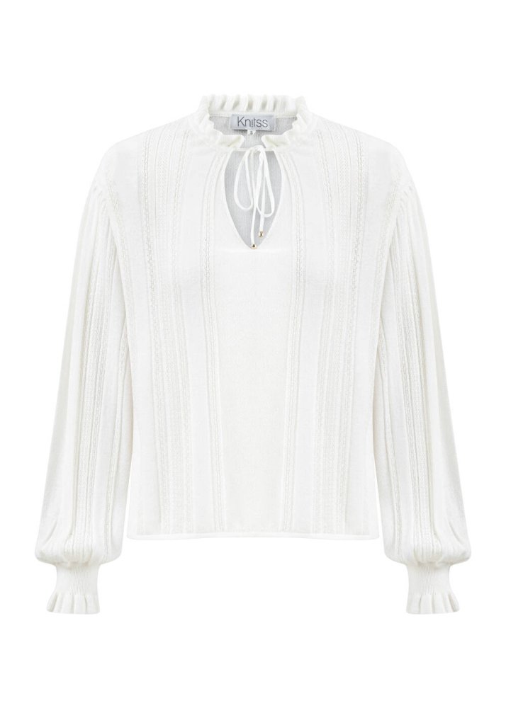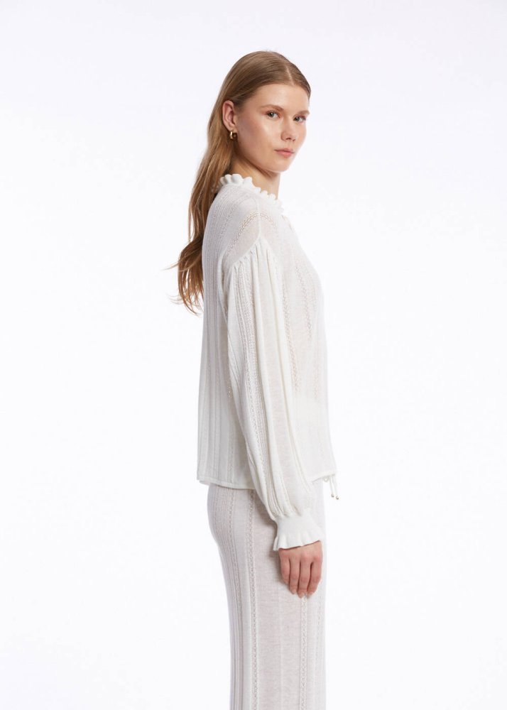 Keten karışımlı sertifikalı İtalyan ipliklerinden üretilen damla yaka bağlamalı uzun kollu beyaz triko, incecik ve hafif yapısı ile yaz sıcaklarında maksimum konfor sunar. Ajur örgü detaylı trikosu, özel tasarım bağcıklı damla yaka modeli, zarif şıklığı ile sofistike bir giyim deneyimi sunan üstü, takımı olan triko pantolonla da kombinleyebilirsiniz.