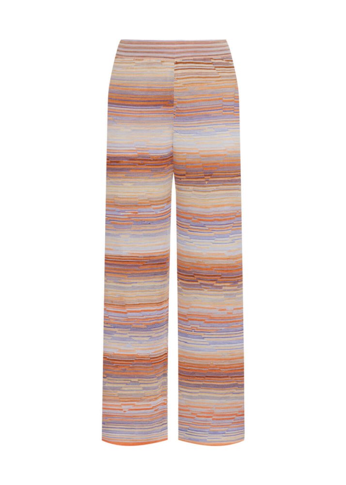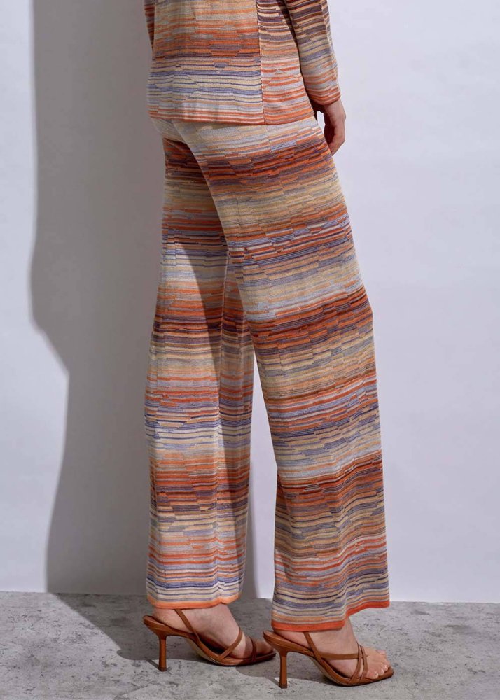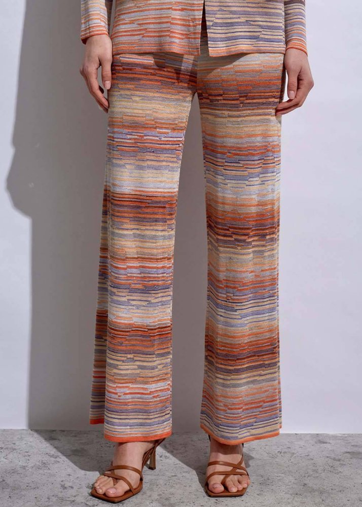 Degrade renk deseniyle kombinlerinize enerji katacak lila triko pantolon için yazlık gardırobunuzda yer açın. Belden lastik detayı ile konforlu bir giyim deneyimi sunan kadın triko pantolon modeli, çevreye duyarlı Knitss kadınları için FSC sertifikalı elyaflardan örülmüştür.