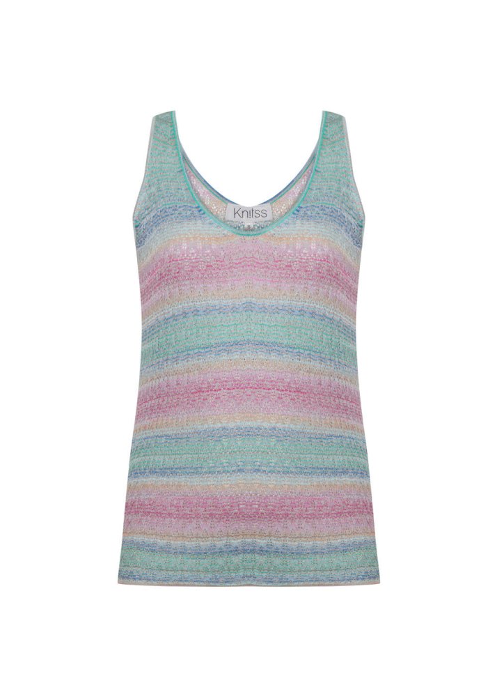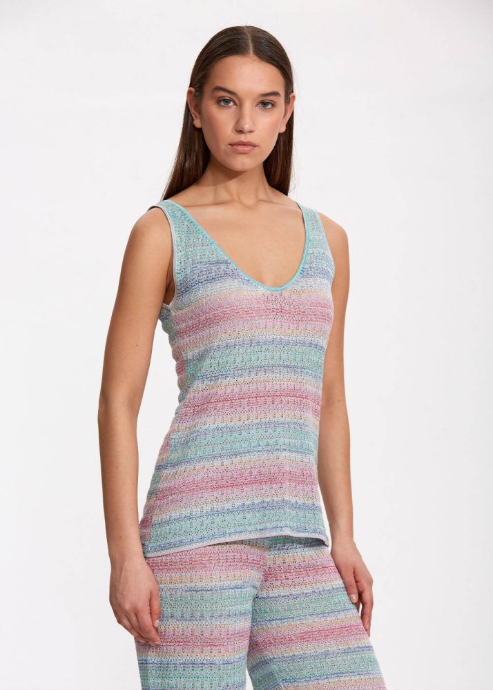 İncecik trikonun üzerinizde dans ettiği V yaka kolsuz üst; turkuaz-pembe degrade geçişli deseni, zarif örgü işçiliği ve rahat kalıbı ile mükemmel bir yazlık kombin tamamlayıcısıdır. Geri dönüştürülmüş sürdürülebilir ipliklerden üretilen triko üst, takımı olan pantolonla ya da tek olarak yazlık stilinize ayrıcalık katar. Günlük veya ofis giyimi için kombinlenmesi kolay bir parçadır.