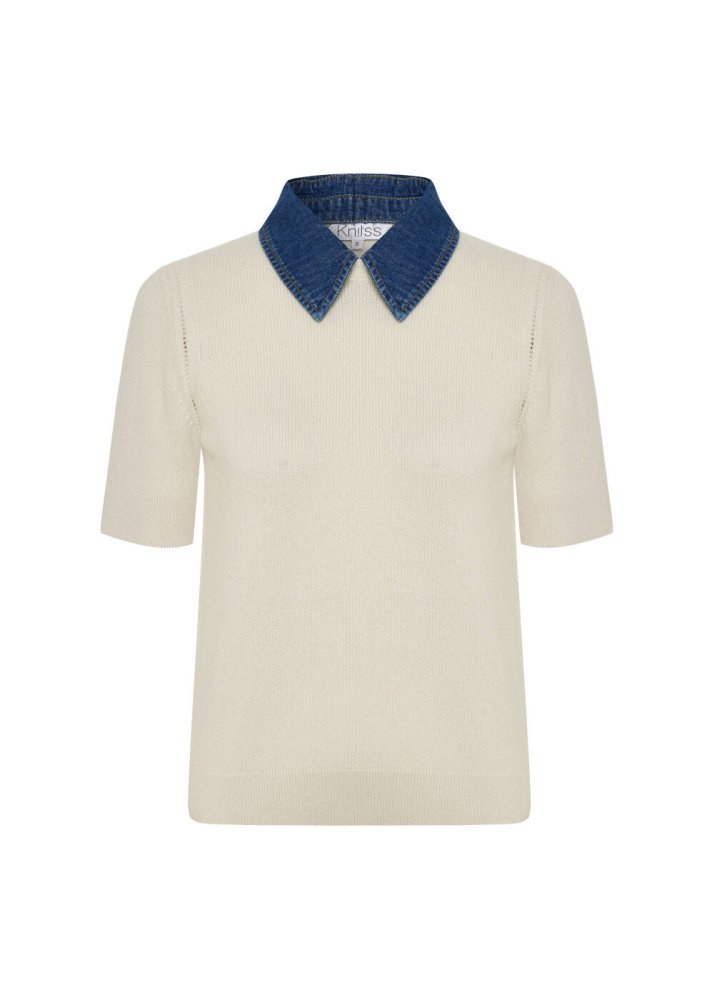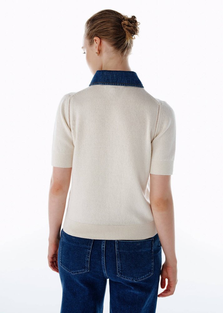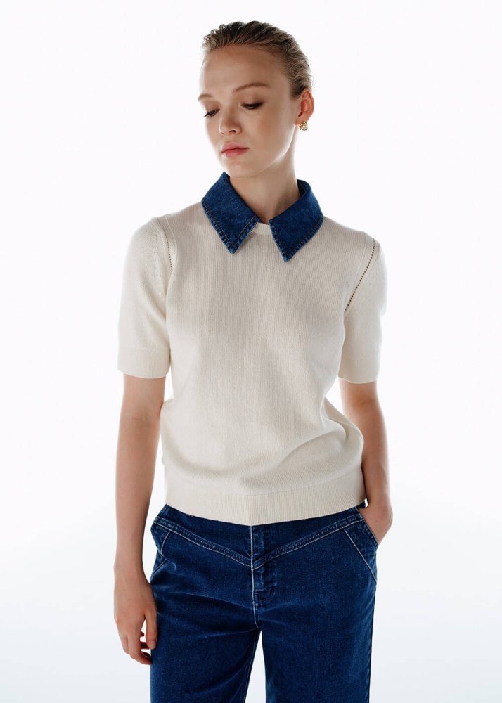 Denim yakasıyla modern bir dokunuş kazanan krem triko üst, rahatlık ve stilin dengeli bir yorumunu sunuyor. Desenli yüzeyi ve kısa kollu formu, parçada dinamik bir görünüm yaratırken, çıkarılabilir yaka detayı sayesinde çok yönlü kullanım olanağı veriyor. Organik pamuk ve kaşmir karışımıyla üretilen bu parça, ister triko altlarla ister denimlerle tamamlanarak stilinizi ortaya çıkarıyor.