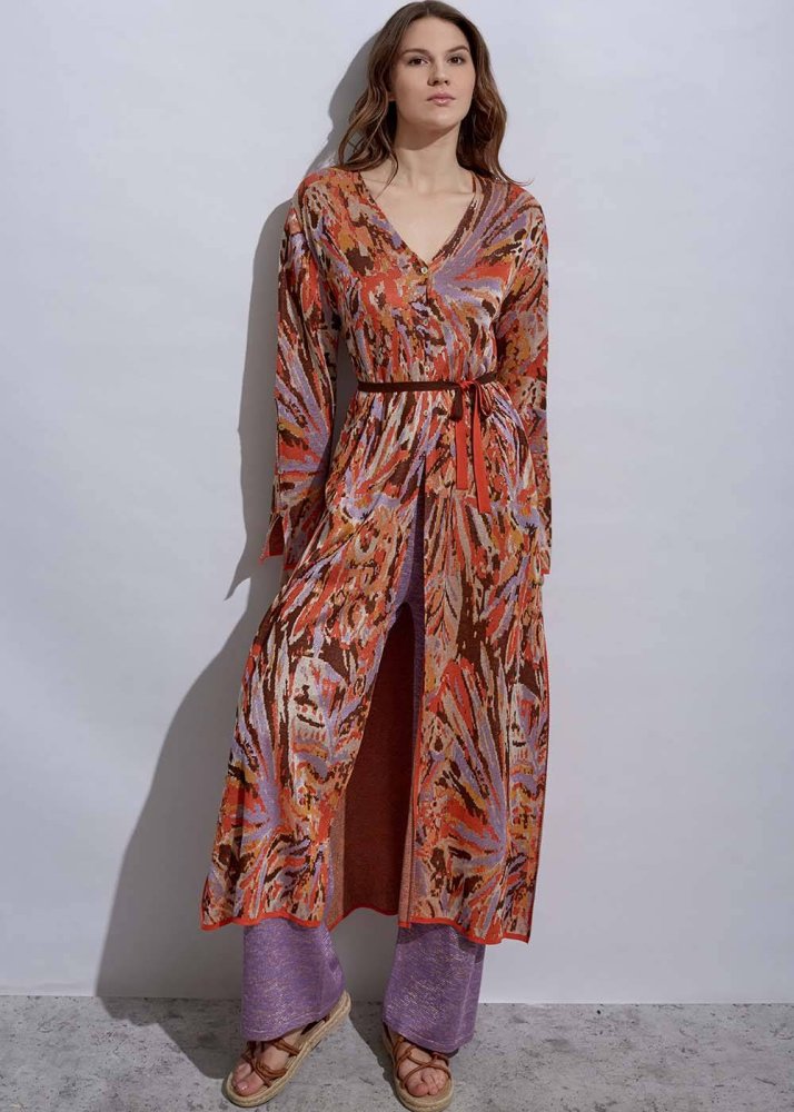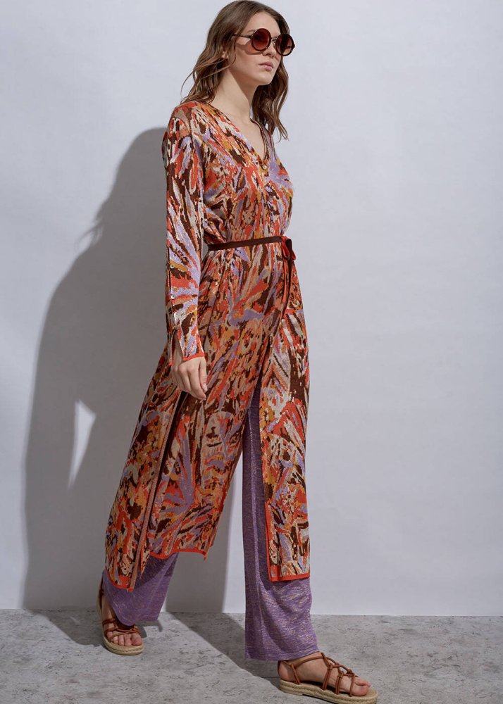 Derin Yırtmaç Detaylı Jakar Desen Triko Tunik