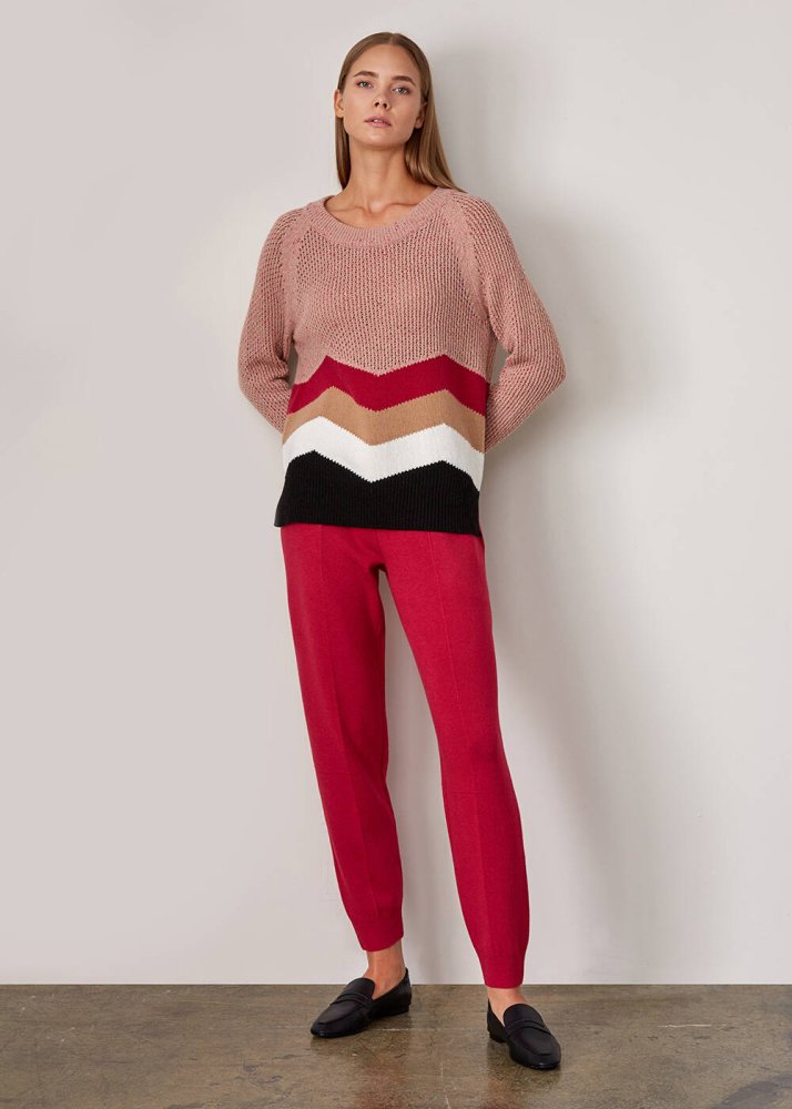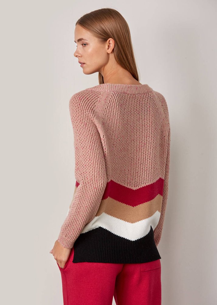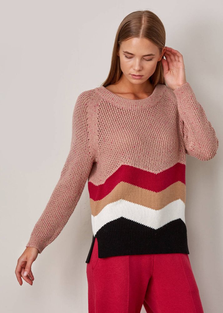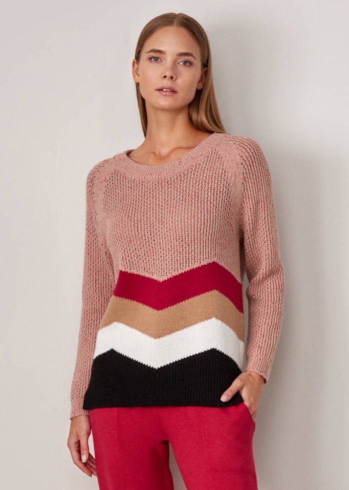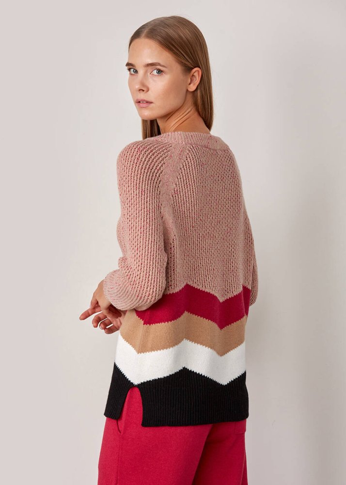 Global Recycled Standard sertifikalı geri dönüştürülmüş elyaflardan üretilen pembe yün triko, hafta içi veya hafta sonu kombinlerinize kolaylıkla uyum sağlar. Zigzak desenli triko kazak, yuvarlak yaka ve özel tasarım örgü detaylara sahiptir.