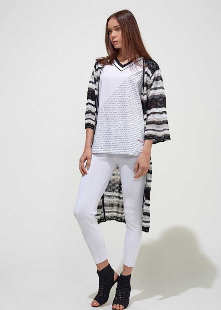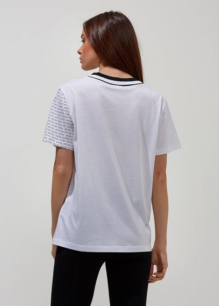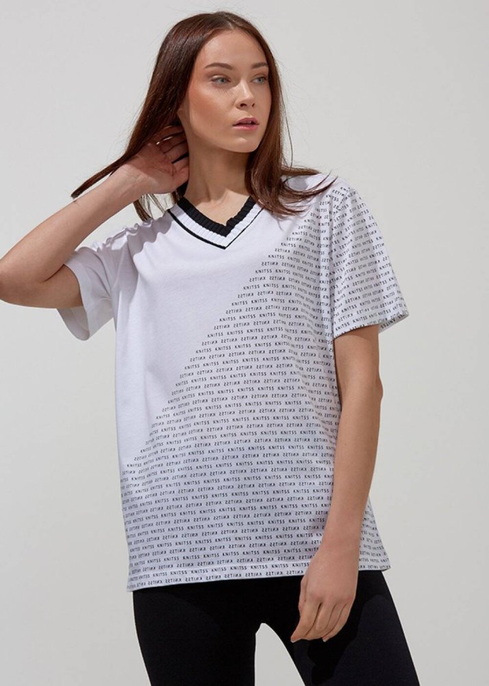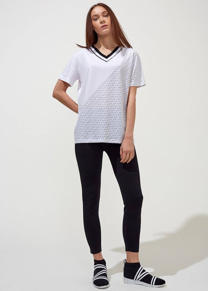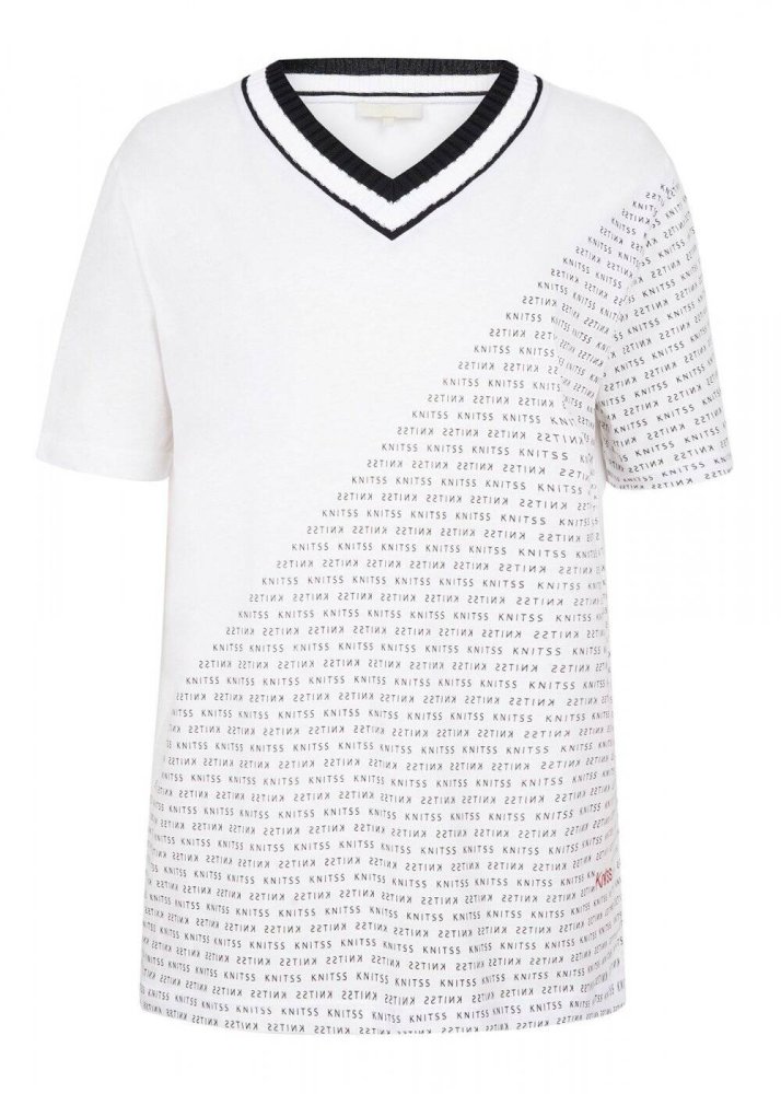 Desenli V Yaka Pamuk Beyaz T-Shirt