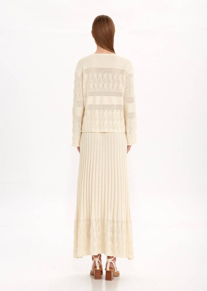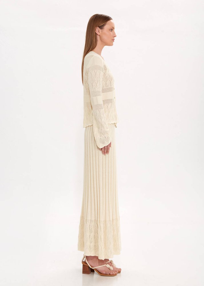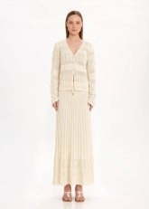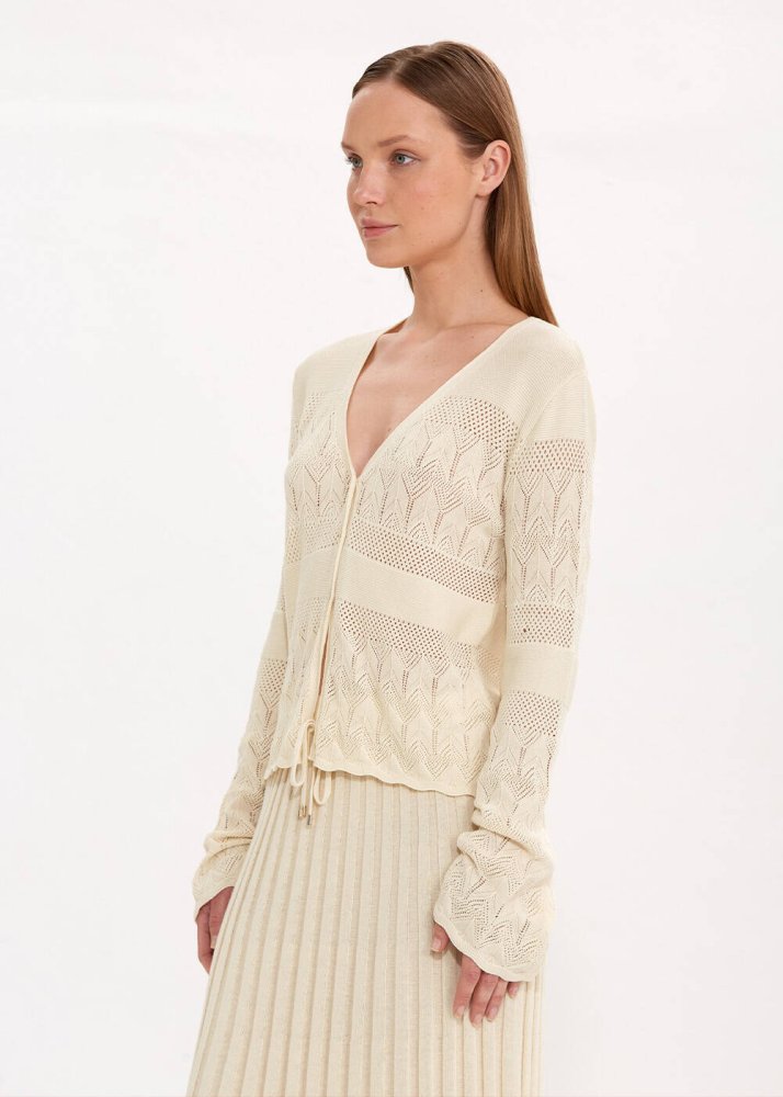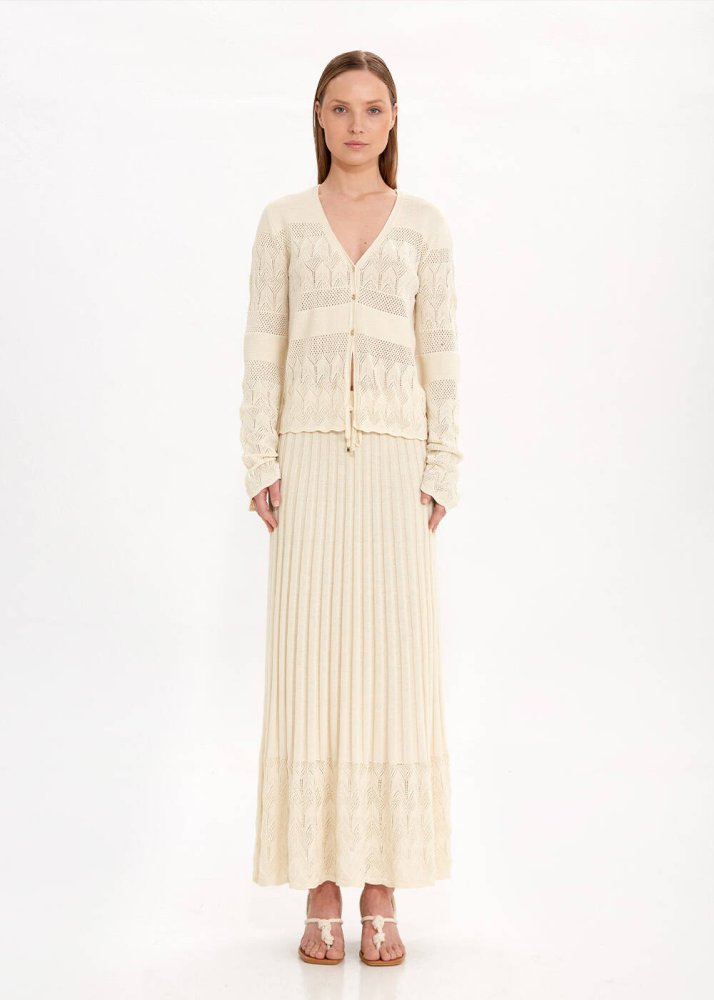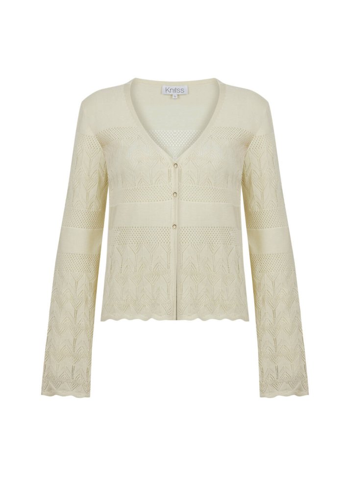 Özel örgü deseni ile romantik bir stil sunan bej triko hırka, yazlık kadın kombinleri için zamansız şıklık sunan kullanışlı bir parçadır. Feminen zarafeti konforla tamamlayan V yaka düğmeli bej hırka, sertifikalı geri dönüştürülmüş İtalyan ipliklerinden üretilmiştir. Sürdürülebilir giyimin çağdaş temsilcisi olan Knitss’in günlük ve ofis kombinleriyle kolayca eşleşebilecek parçalarından biridir.
