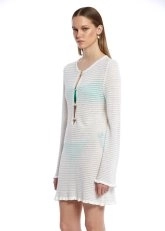 Knitss'in zarif tasarımlarından biri olan düğme kapamalı beyaz mini triko elbise, sade ama şık bir görünüm arayanlar için mükemmel bir seçenek. Beyaz renginin ferahlatıcı etkisi, plajda ya da sıcak yaz günlerinde size hafiflik ve rahatlık sunar. Elbisenin taşlı düğme detayları, şıklığına zarif bir dokunuş eklerken, ajur örgü detayı da tasarıma hafif bir doku katıyor. Mini boyu ile de rahat hareket edebilmenizi sağlayan bu model, yazın vazgeçilmezi olacak.