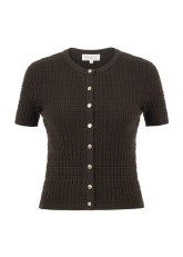 Koyu kahverengi triko üst, düğme kapamalı formu sayesinde klasikle moderni birleştiriyor. Kısa kollu yapısı sayesinde tek başına konforlu bir seçimken, aynı renkteki