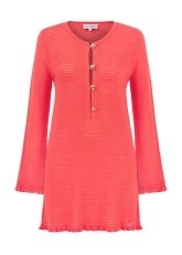 Gardırobunuzda dinamik bir dokunuş arıyorsanız, Düğme kapamalı mercan mini triko elbise tam da ihtiyacınız olan parça. Enerjik mercan rengi, plaj şıklığınızı bir üst seviyeye taşıyacak kadar canlı ve taze. Taşlı düğme detayları, elbiseye zarif bir dokunuş eklerken, mini boyu sıcak yaz günlerinde rahatça kullanılabilecek mükemmel bir seçenek sunuyor. Plajda, öğle yemeklerinde ya da akşam gezmelerinde rahatlıkla şıklığınızı konuşturabilirsiniz. Knitss’in beachwear koleksiyonunun zarif bir parçası olan bu elbise, stil sahibi her kadının gardırobunda mutlaka yer almalı.