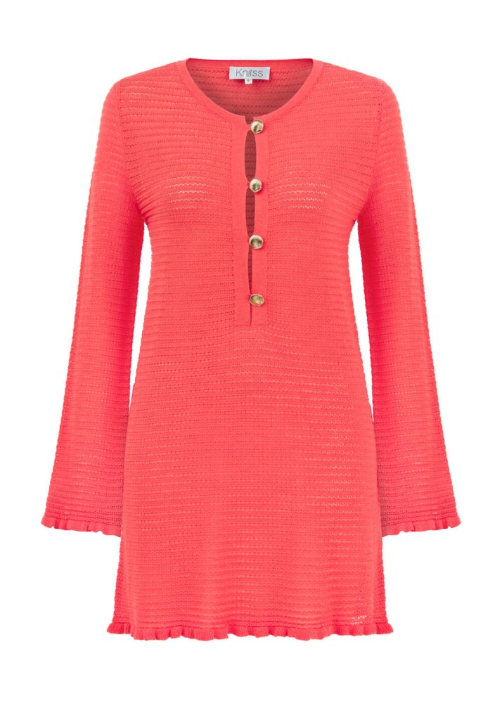Düğme Kapamalı Mercan Mini Triko Elbise