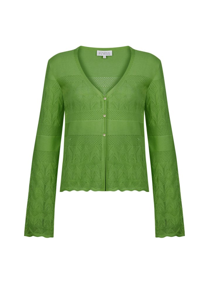Triko zarafetini özel örgü deseni ve romantik stili ile tamamlayan yeşil hırka, günün her anına uygun şıklığı ile yaz kombinleri için harika bir parçadır. Sürdürülebilir İtalyan ipliklerinden üretilen V yaka düğmeli yeşil hırka, özgün triko deseni ile hayranlık uyandırır. Takımı olan uzun triko etekle ya da Knitss’in alt grubundan birçok parça ile kolayca kombinlenebilir.