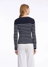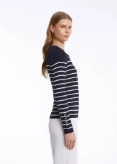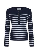 Enine beyaz çizgili lacivert uzun kollu düğmeli yaka triko, zamansız şıklığı ile yazlık giyim dolabınızın en kullanışlı parçalarından olmaya adaydır. İtalyan ipliklerinden üretilen beyaz çizgili lacivert üst; vücuda tam oturan kalıbı, rahat ve spor kombinlere uygun düğmeli yaka modeli, marin temasındaki stili ile kullanışlı ve şık bir parçadır.