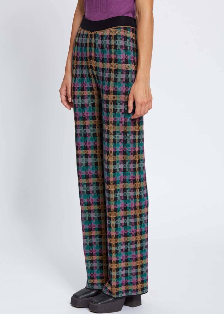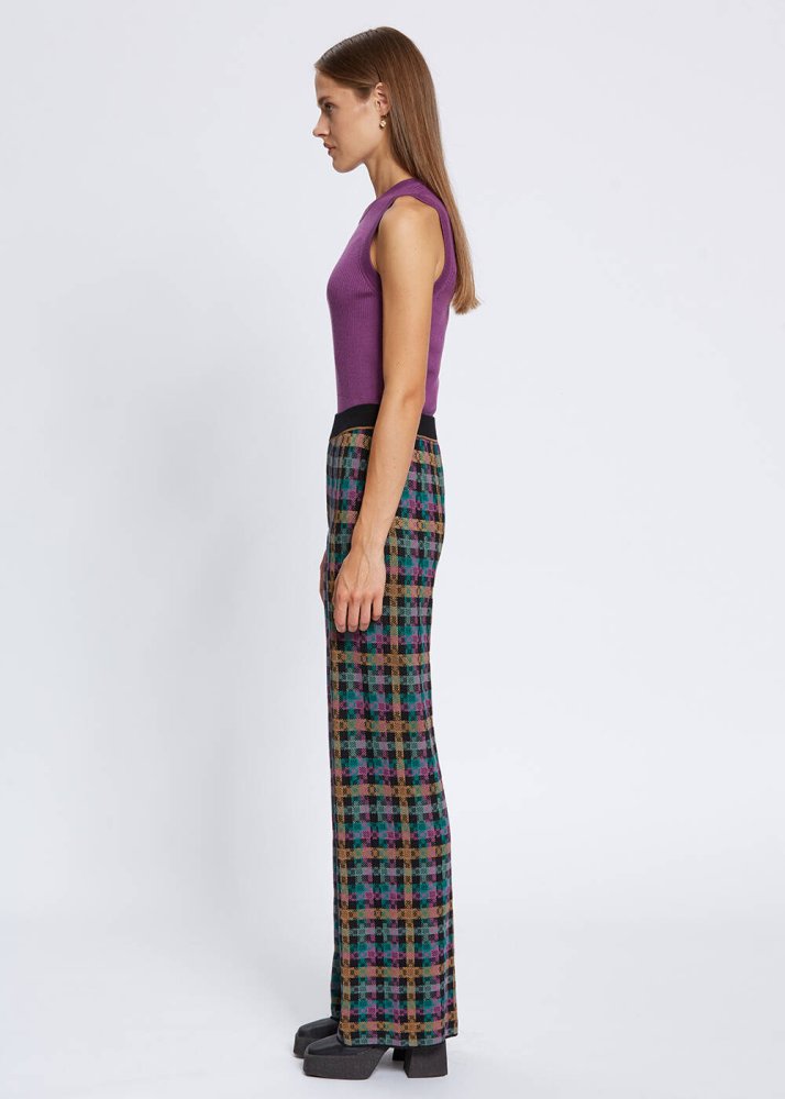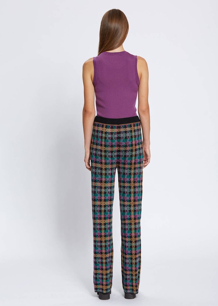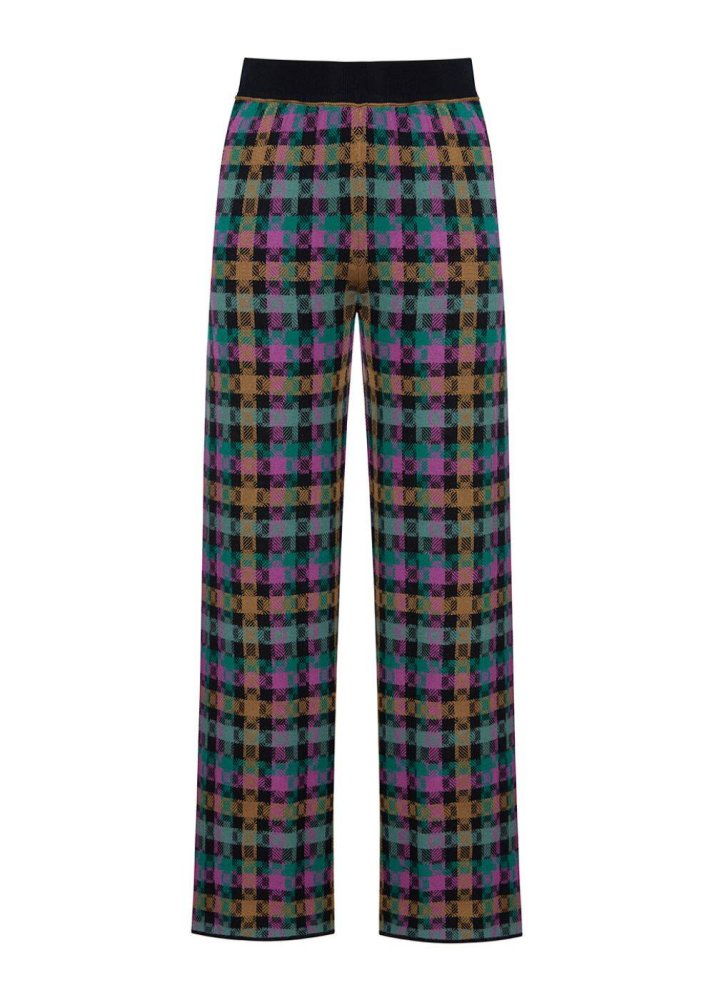 Knitss’e özgü çağdaş geometrik desenlerin çarpıcı renklerle buluştuğu ekose desenli jakar triko pantolonla özgün ruhunuzu stilinize yansıtın. Çevre dostu FSC sertifikalı viskon ipliğinden sürdürülebilir modacılık ilkelerine uygun olarak üretilen mor-yeşil ekose desenli triko pantolon, rahat kalıbı ve elastik beli ile de ekstra konforludur.