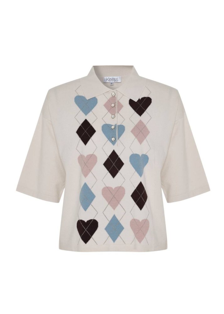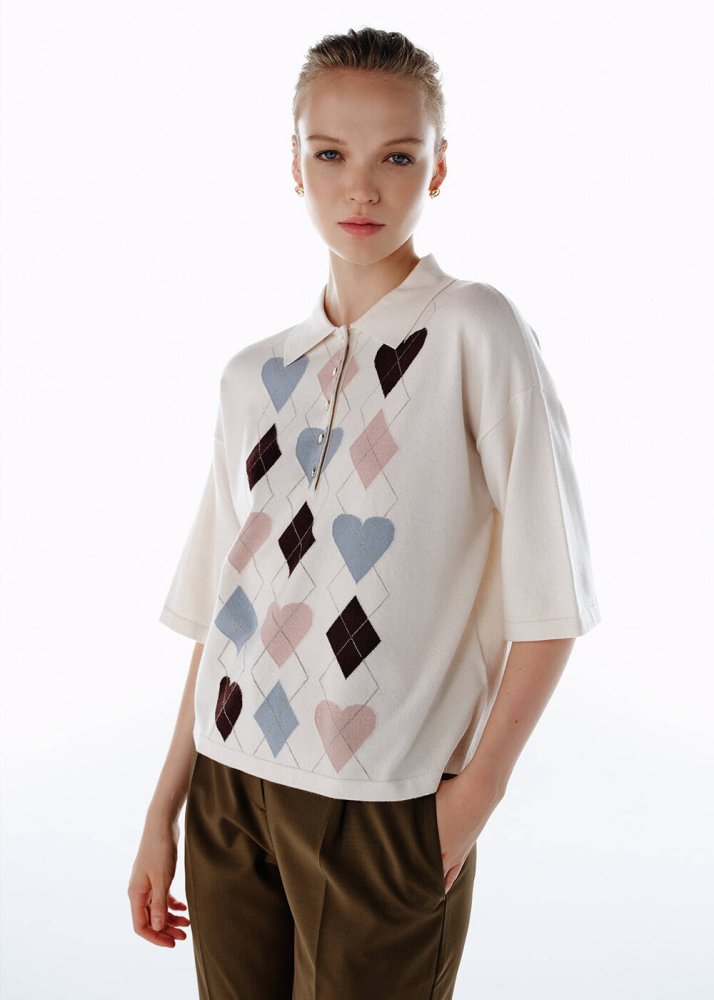 Zarif ve romantik bir tavırla tasarlanan kalpli intersia desen triko üst, ekru tonunun saflığını, kalp desenlerinin sıcak romantizmiyle buluşturuyor. Kalp desenleriyle neşeli bir ifade kazanan model, polo yaka ve düğme kapamalı detayıyla sportif ama sofistike bir görünüm sunar. Yumuşak dokulu İtalyan ipliğiyle örülen kumaşı, gün boyu konfor sağlarken, %53 viskon, %25 polyester ve %22 poliamid karışımı formunu koruyan bir duruş yaratır.