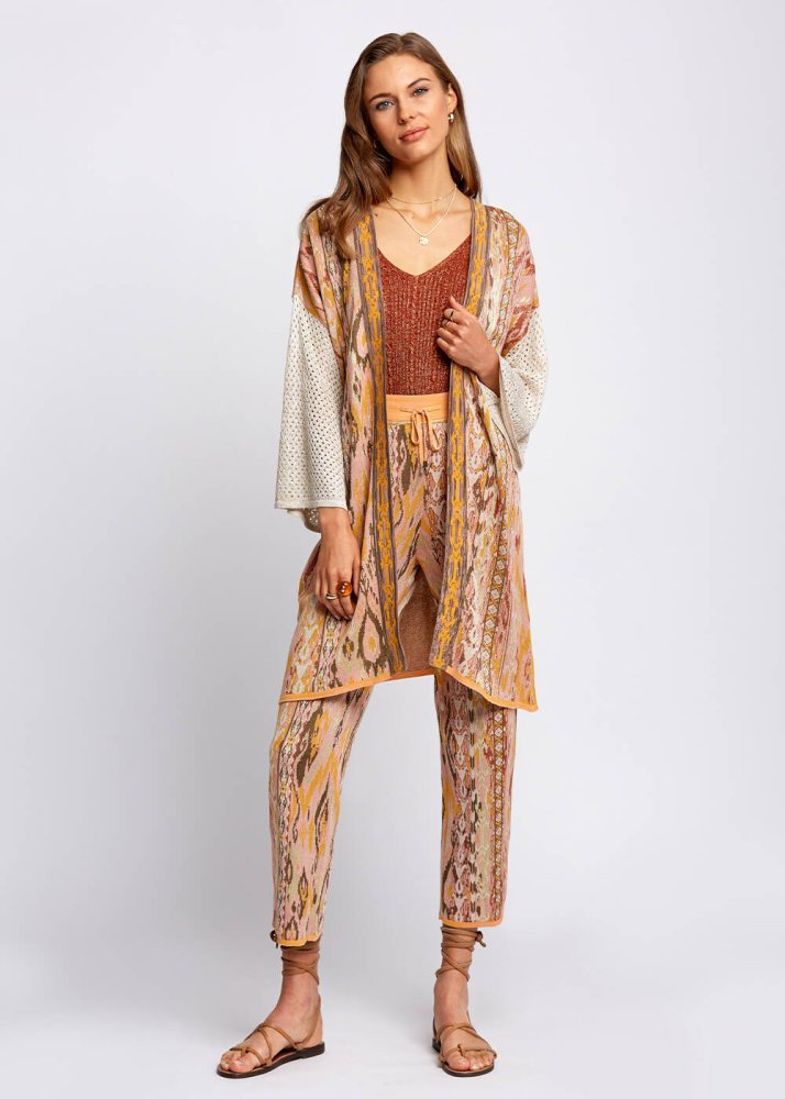 Etnik desenli triko pantolon hem yanlardan hem belinde gold dikiş detayı ile Knitss şıklığını gardırobunuza taşıyor. Jakar örgü triko pantolon, hafif kısa paçalı ve cep detayı ile konforlu bir giyim deneyimi sunar. Pili detaylı triko pantolon, hafta içi ve hafta sonu kombinleriniz için idealdir.