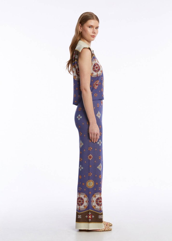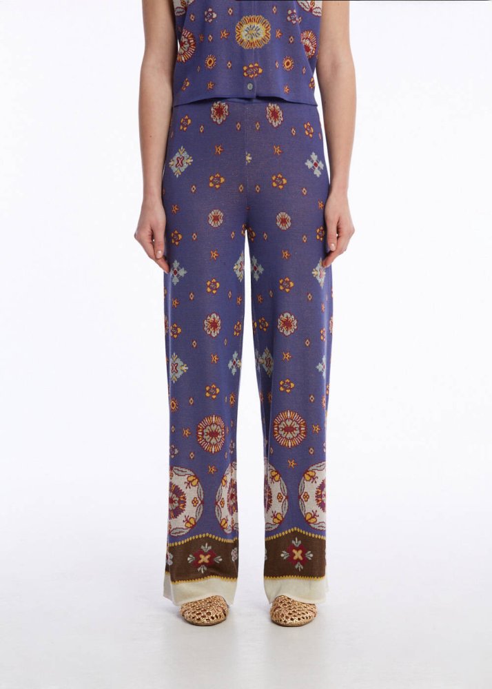 Çok şık etnik deseni ve çarpıcı renkleri ile ilk bakışta dikkat çeken triko pantolon ile her ortamda fark yaratın. Knitss’in çağdaş triko stilini kadim etnik desenle buluşturan çok renkli triko pantolon, pamuk karışımlı geri dönüştürülmüş İtalyan ipliklerinden üretildi. Rahat kalıbı ve elastik beli ile konforu önceleyen şıklığa sahiptir.