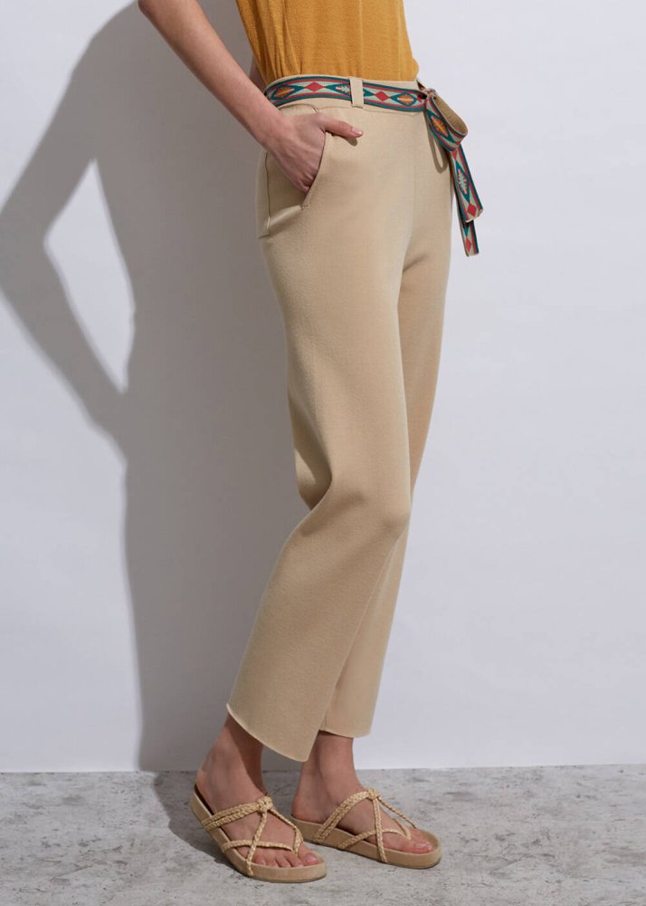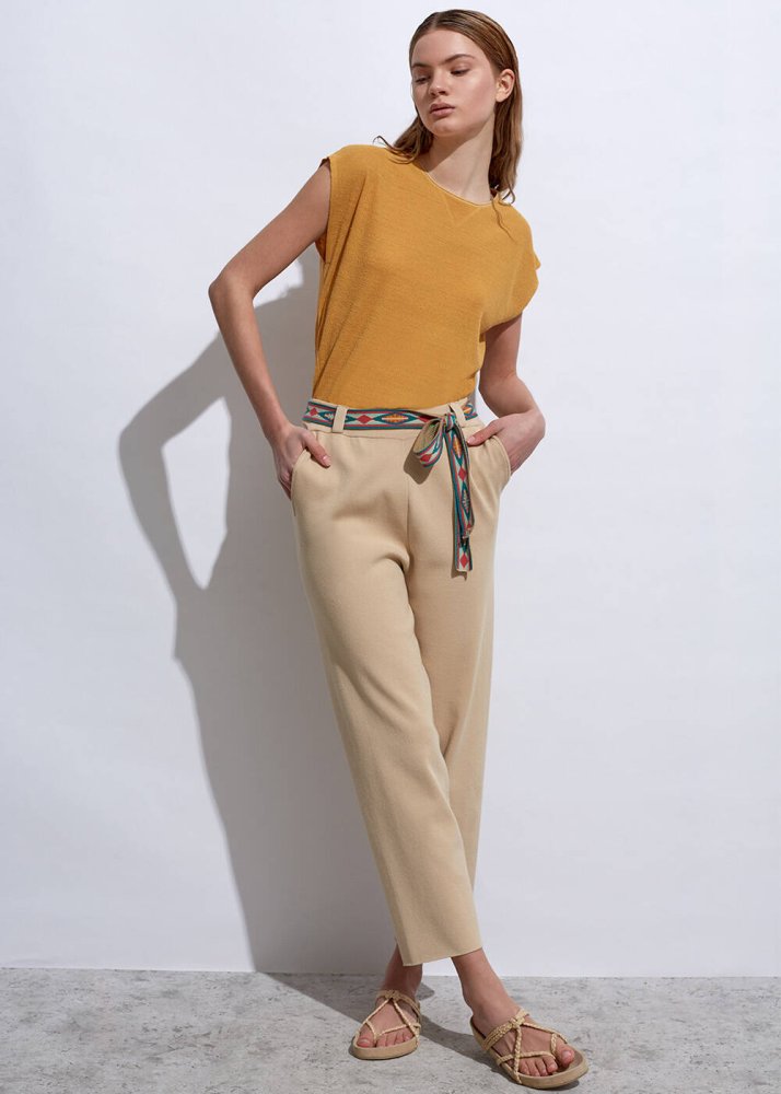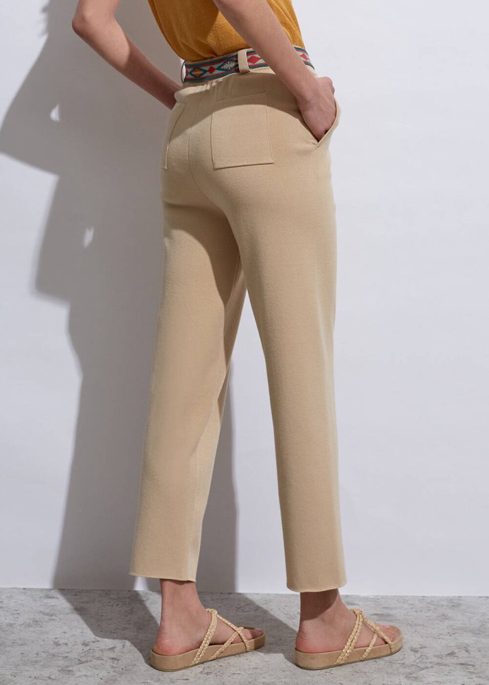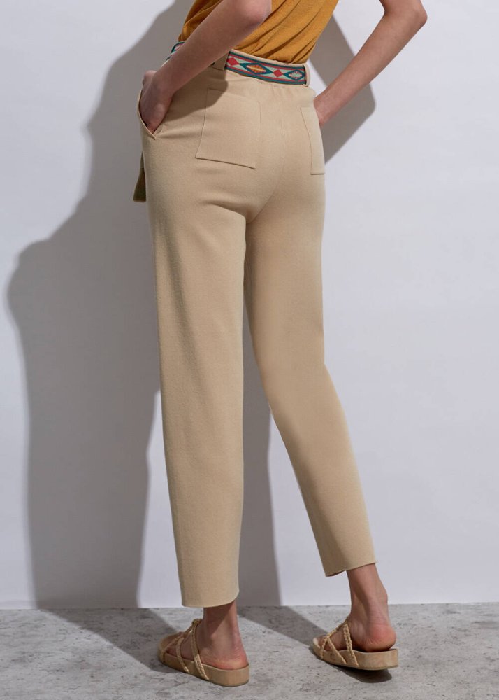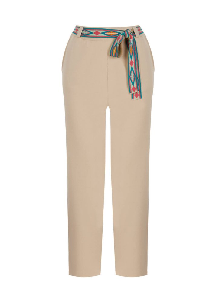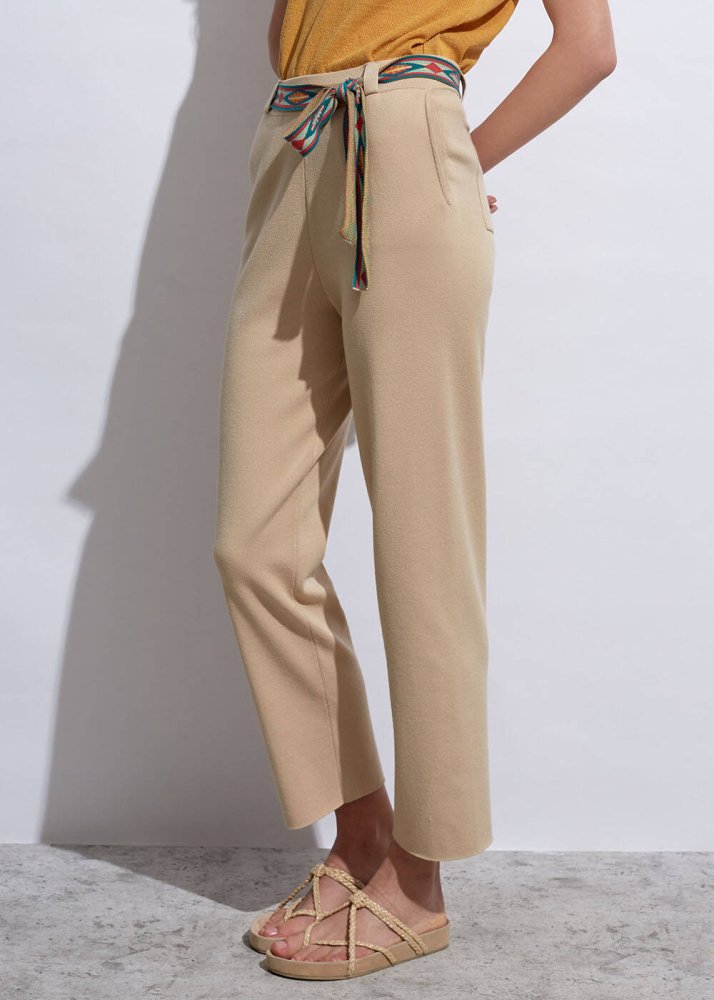 Etnik şerit desenli kemeri ile stilinize şık bir dokunuş katacak triko pantolona gardırobunuzda yer açın. Bej triko pantolon modeli, yan ve arka cep detayına ve rahat bir kalıba sahiptir. Business ve günlük stilinize kolayca uyum sağlayacak kadın triko pantolonu, koleksiyonda yer alan diğer parçalarla kombinleyebilirsiniz.