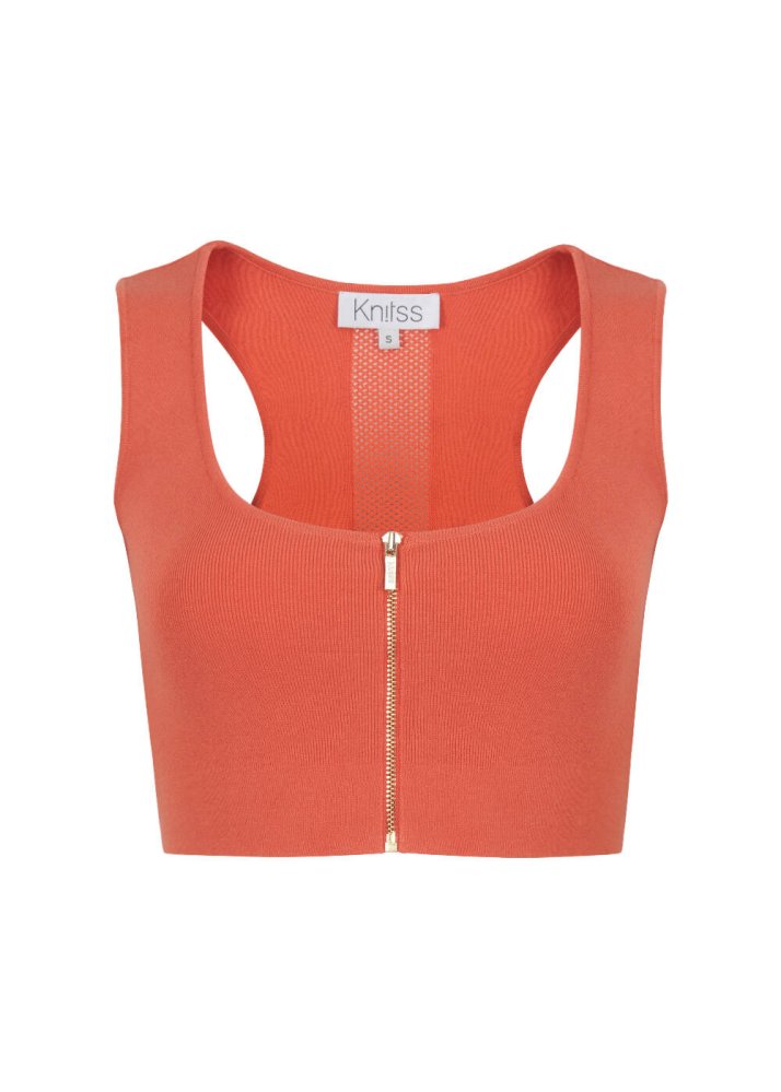 Fermuarlı Kolsuz Mercan Rengi Crop Triko Üst