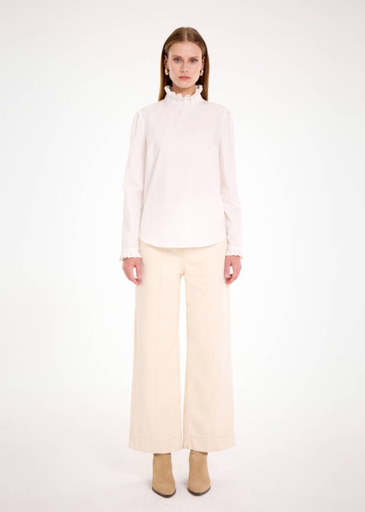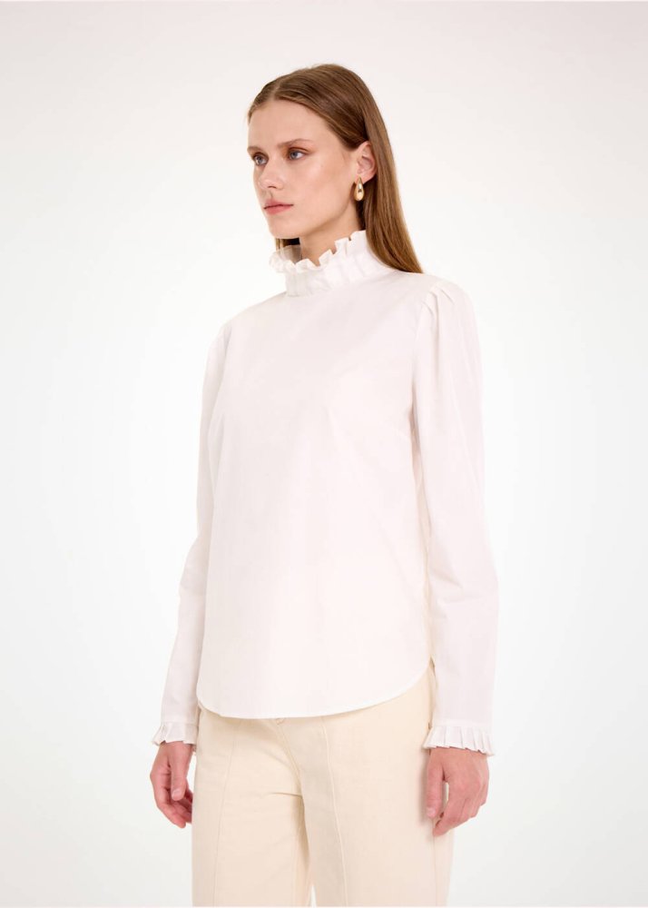 Yaka ve kol uçları fırfır detaylı saf pamuk beyaz gömlek; ofis ve özel gün kombinlerinize ayrıcalık katacak şık ve rahat bir parçadır. Organik pamuk poplin kumaşın nefes alan doğal yapısı sayesinde terletmez, gün boyu konfor sunar. Rahat kesimi ve mükemmel duruş sağlayan kalıbı sayesinde çağdaş bir stildedir. İster denim pantolonlarla ister triko eteklerle rahatlıkla kombinleyebilirsiniz.