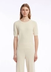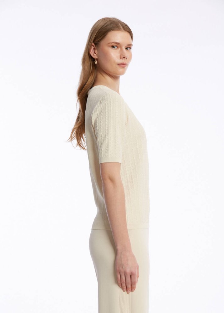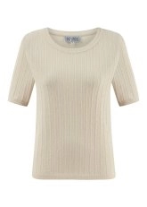 Konforu zarif işçilik ve zamansız şıklıkla buluşturan bej rengi fitil örgü kabartmalı yarım kollu üst, İtalyan ipliklerinden üretildi. Rahatlığı ve günün farklı anlarına zahmetsizce uyum sağlayan çağdaş triko stili ile hem günlük hem ev hem de ofis kombinleriniz için vazgeçilmez bir parçadır.