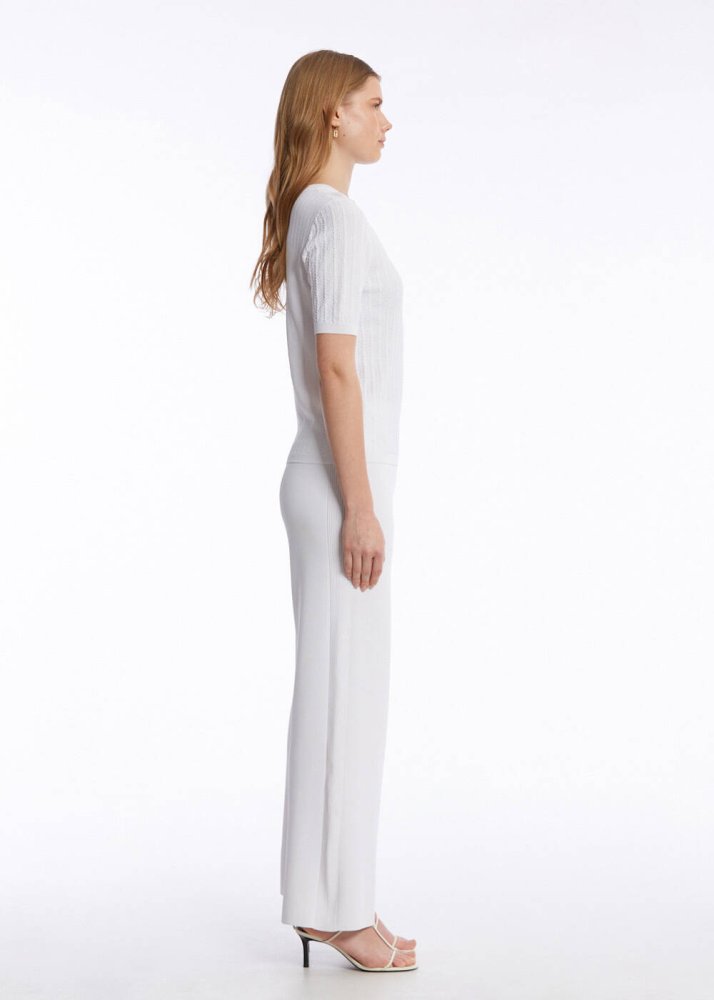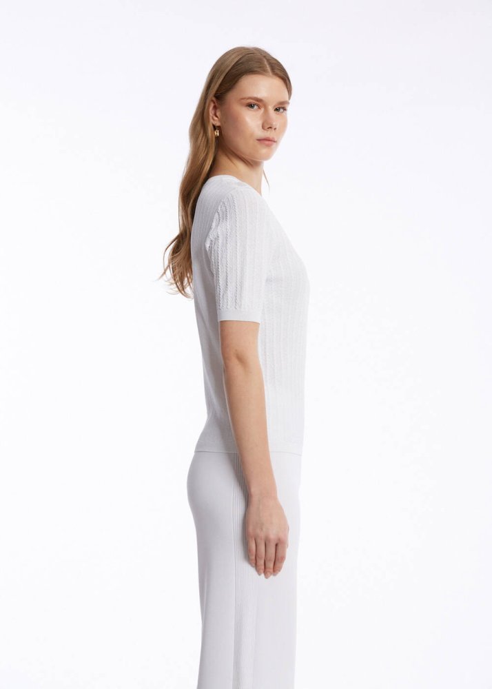 Fitil örgü kabartmalı beyaz yarım kollu triko üst, minimal şıklığı ve çağdaş triko stili ile farklı tarzlara kolayca uyum sağlar. İster günlük ister ofis kombinlerinize ait parçalarla rahatlıkla eşleştirebileceğiniz zamansız stilini, Knitss’e özgü zarif işçilik ve İtalyan iplik kalitesi ile buluşturur. Yarım kollu beyaz triko üst, giyim dolabınızın kurtarıcı parçalarından olmaya adaydır.