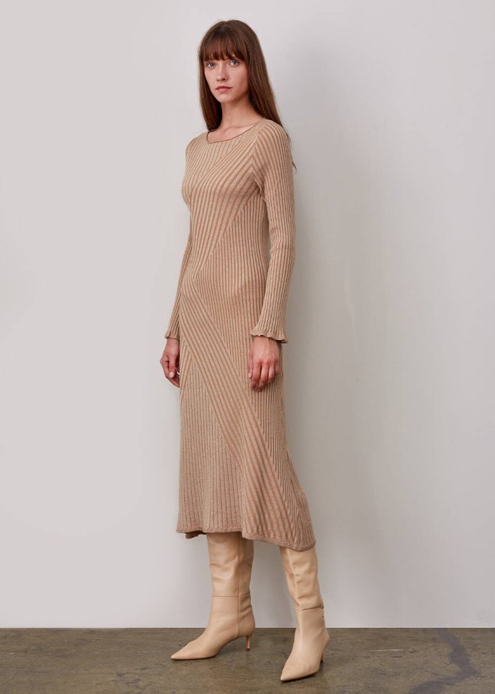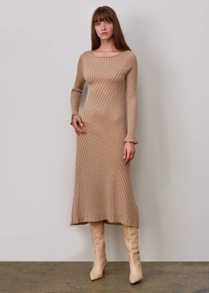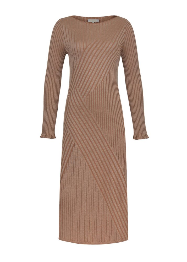 Fitil Örgü Detaylı Bej Midi Yün Triko Elbise
