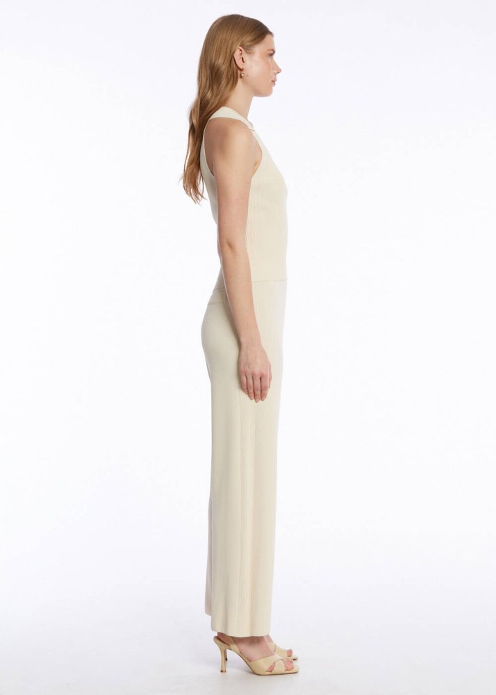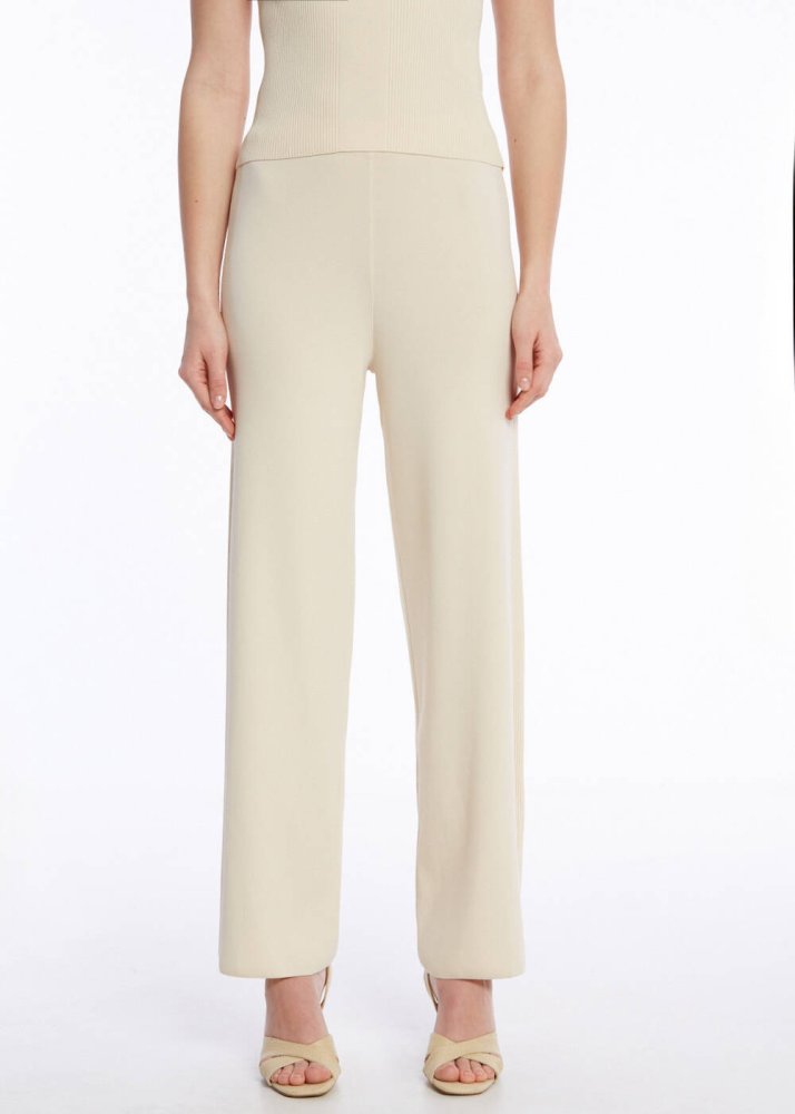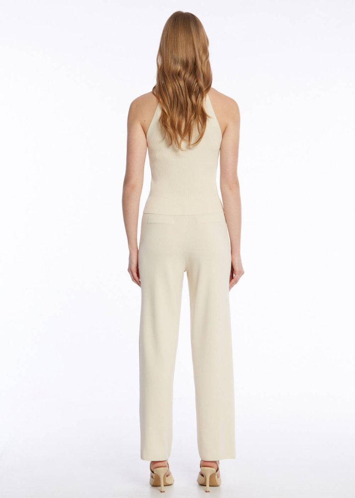Fitil örgü detaylı bej rengi triko pantolon, minimal şıklığı ile giyim dolabınızın kurtarıcı parçalarından olmaya adaydır. Konforlu ve şık kadın kombinlerinin olmazsa olmazlarından triko pantolon şıklığını yazlık kombinlere de yaşıyan bu parça, ofis kombinlerinden günlük kullanıma, günün her anına zahmetsizce uyum sağlar.
