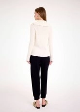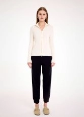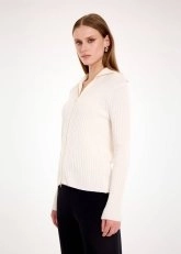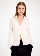 Geri dönüştürülmüş Merino yünü, kaşmir ve İtalyan iplik içeriği ile sürdürülebilir moda ilkelerine uygun olarak üretilen ekru fitilli hırka, iki yönlü fermuar tasarımı ile dikkat çeker. Doğa dostu elyaf kalitesini mükemmel kalıp ve günün her anına uygun çağdaş stili ile tamamlayan fitilli ekru hırkayla giyiminize özgünlük katın.