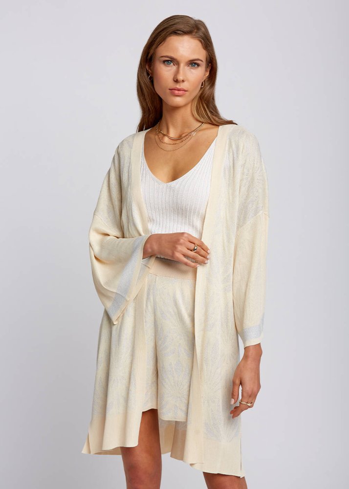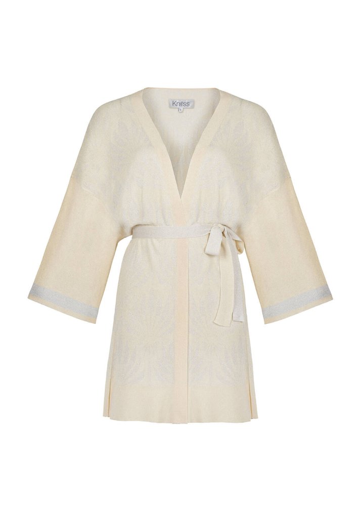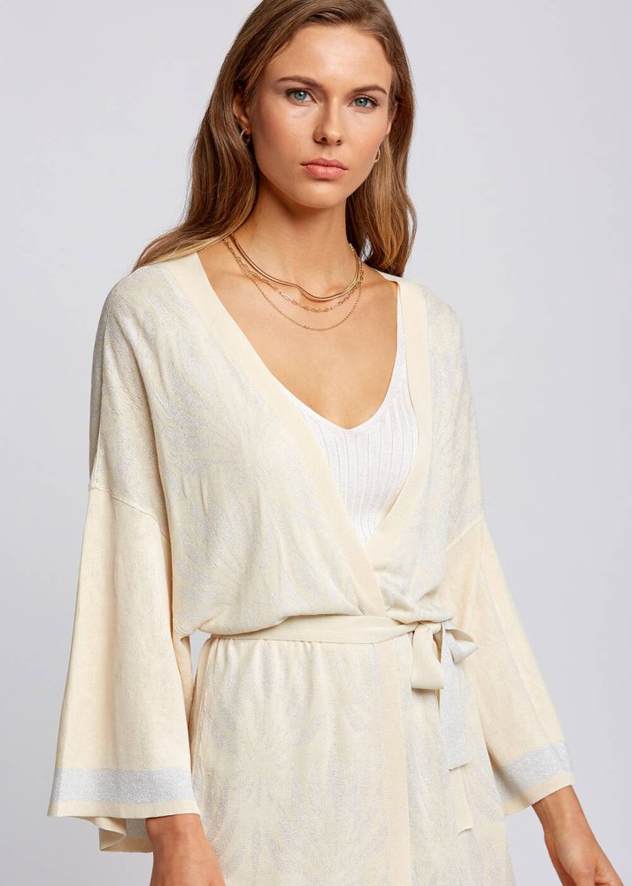 Bej triko kimono, çevreye duyarlı modern kadınlar için ormanlarda biyolojik çeşitliliğin korunmasına yardımcı olan FSC sertifikalı İtalyan iplikten üretilmiştir. Floral desenli triko kimono, kuşak detayı ve rahat kalıbı ile konforlu bir giyim deneyimi sunar. Koleksiyonun diğer parçaları ile rahatlıkla kombinleyebileceğiniz triko kimono modeli, business ve günlük stilinize kolaylıkla uyum sağlar.