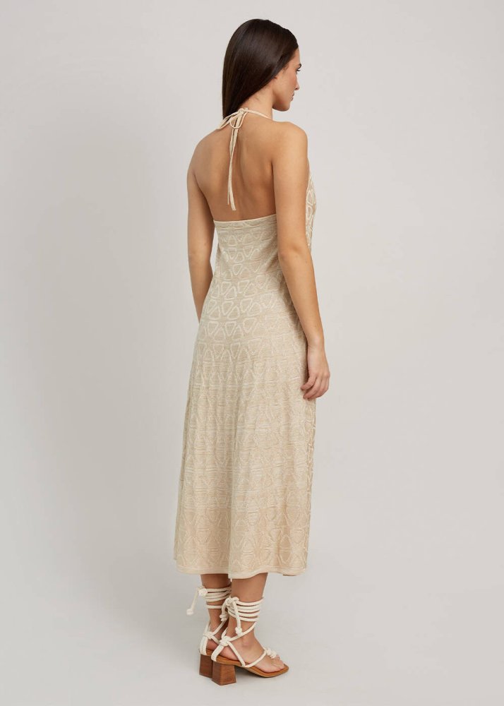 Romantik stili ile hayranlık uyandıran uzun bej triko elbiseyi keşfedin. Knitss özel tasarım triko elbise, boyundan bağlı sırtı açık modeli, volanlı etek ucu, sofistike geometrik deseni ve nitelikli İtalyan iplik kalitesi ile ayrıcalıklıdır. Üretiminde kullanılan iplikler geri dönüşümlüdür. İnce ve uçuşkan tarzı ile çok şık bir yazlık triko elbisedir.
