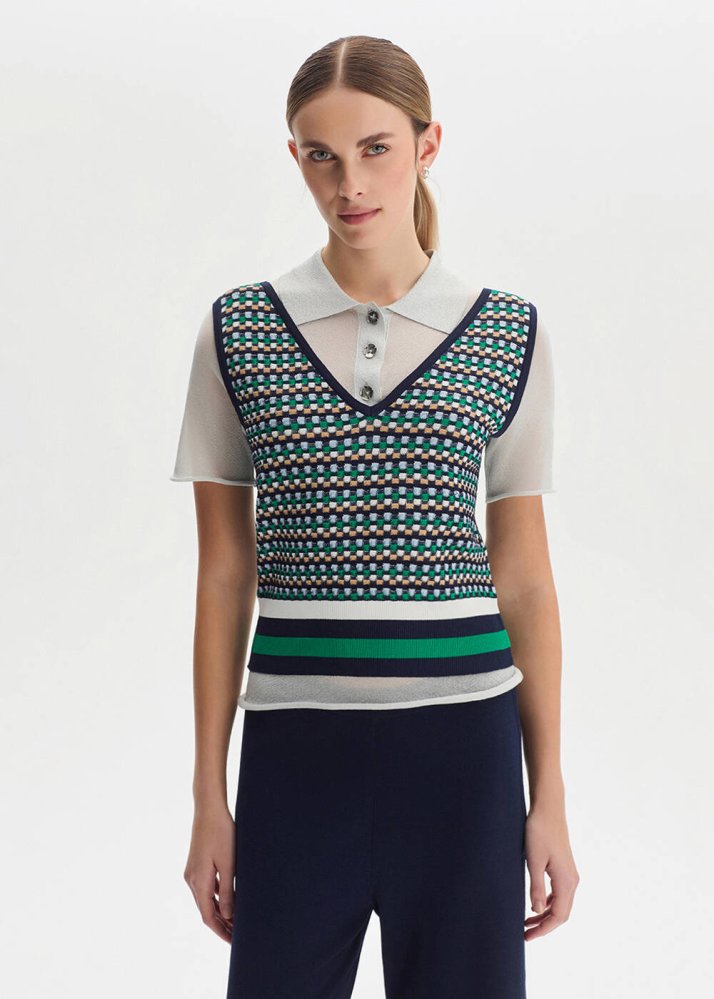 Geometrik Desenli Beyaz Triko Üst