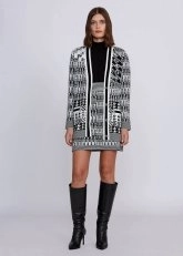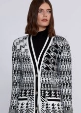 Business kombinlerinizin favori parçası olacak Knitss triko hırka, ideal siyah-beyaz rengi, taş düğme ve dekoratif cep detaylarına sahiptir. Geometrik kaz ayağı desenli ile business kombinlerinize hareket katacak kadın triko hırka modelini takımı olan Gayo Skirt ile kombinleyebileceğiniz gibi koleksiyonda yer alan diğer parçalarla da uyum içerisindedir.