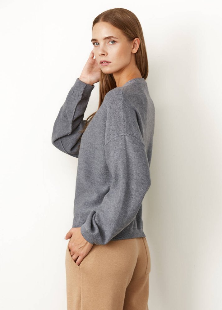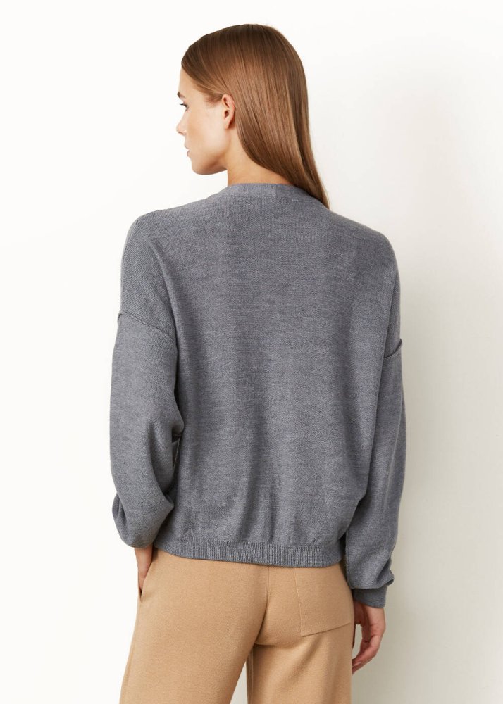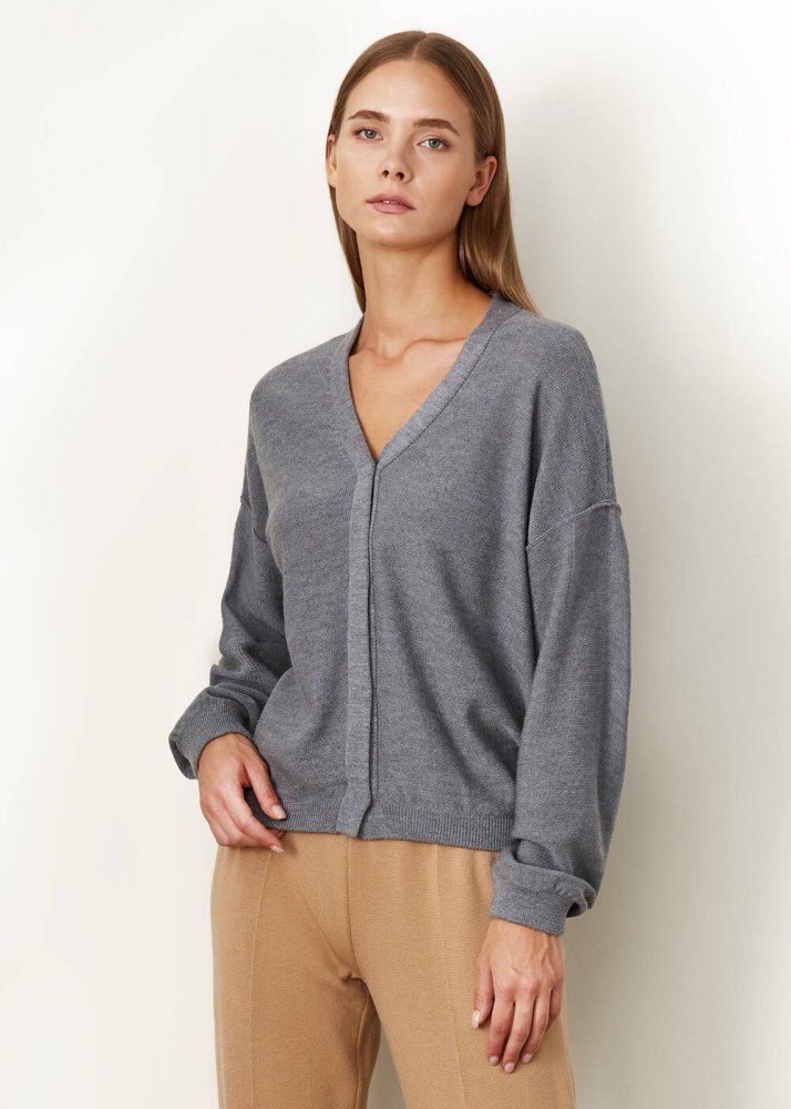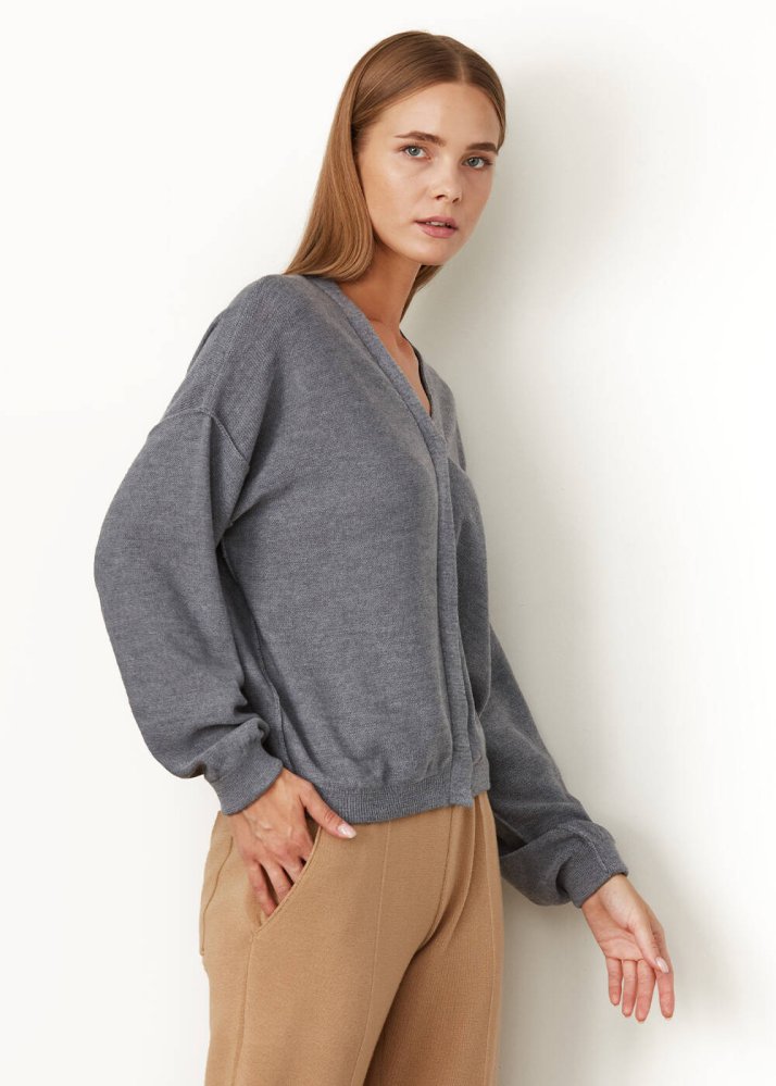Gizli düğmeli gri Merino yün hırka, dökümlü modeli ile şıklığı konforla buluşturur. %100 İtalyan Merino yününün terletmeden ısıtan uzun ömürlü yapısına sahip gri hırka, gizli düğme detayı ve pile desen triko modeli ile Knitss’in çağdaş özel tasarımlarındandır. Kullanışlı modeli, konforu ve zamansız gri rengi ile dolabınızın ideal kombin tamamlayıcısını keşfedin.