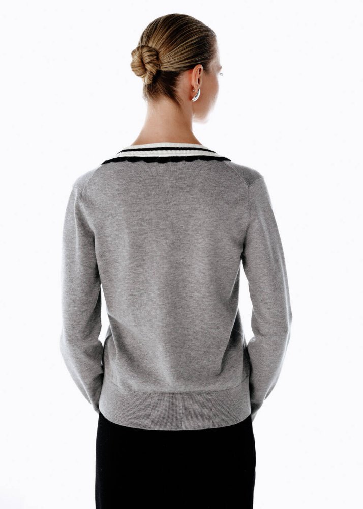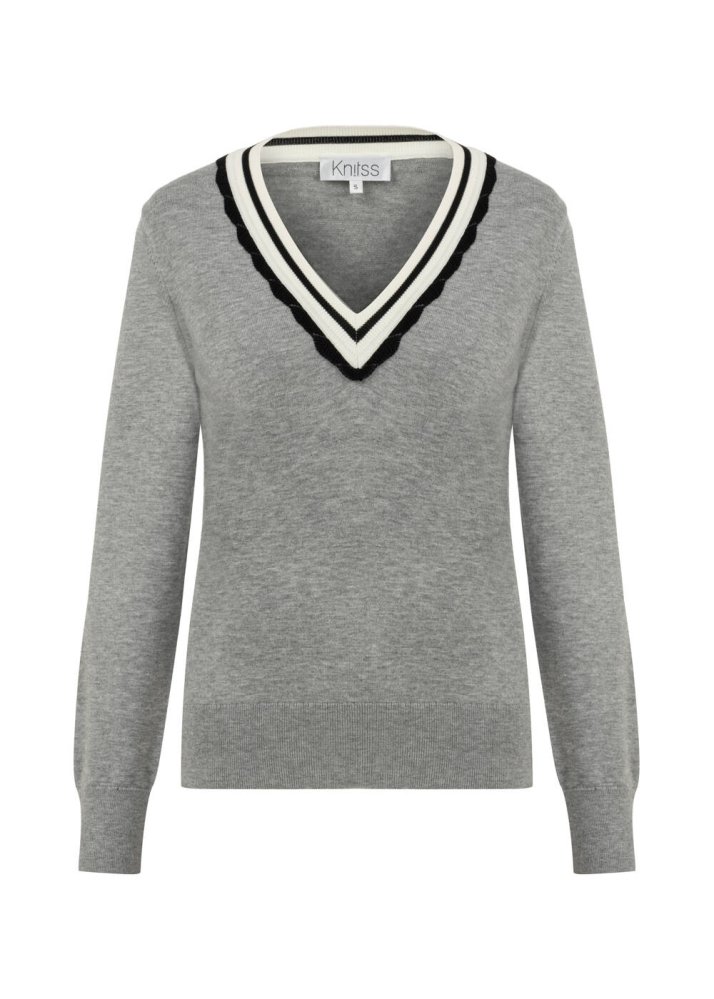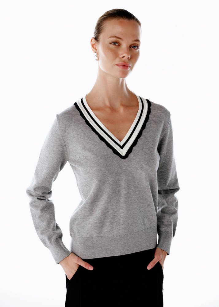 GREY CONTRAST STRIPED V NECK SWEATER