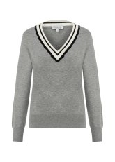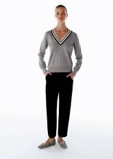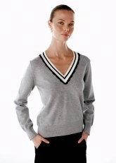 Çağdaş KNITSS kadınının zahmetsiz zarafetini yansıtan bu gri v yaka triko, kontrast şerit detaylarıyla sade çizgilere modern bir dokunuş kazandırıyor. İtalyan ipliğin üstün kalitesiyle örülen dokusu, gün boyu konfor ve şıklığı bir arada sunuyor. Triko pantolonlarla, denimlerle ya da eteklerle kombinleyerek farklı stiller yaratmak mümkün. %70 FSC Viskon ve %30 Polyester karışımıyla formunu koruyan bu parça, dolabınızın kurtarıcılarından olacak.