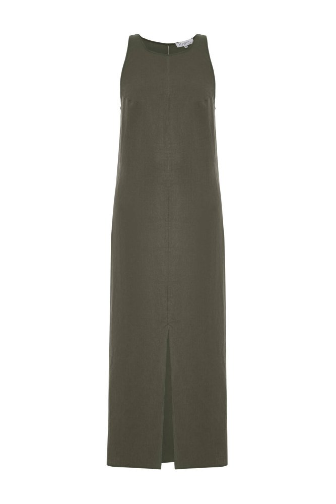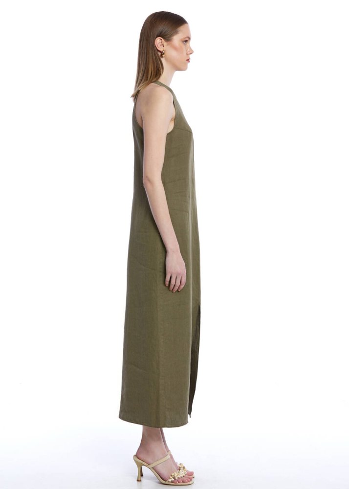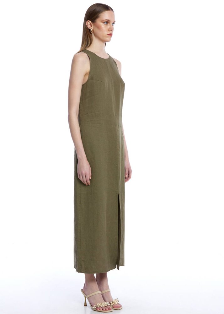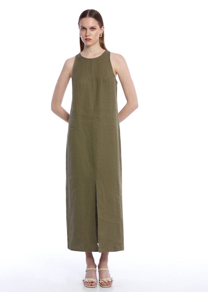 Haki Yırtmaç Detaylı Keten Elbise