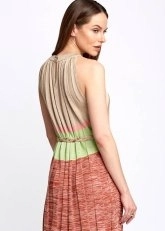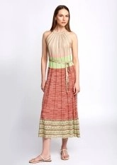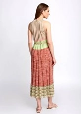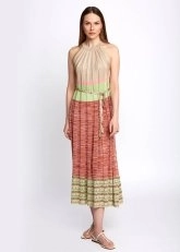 Knitss’in renk ve desen oyunlarını üzerinde taşıyan halter yaka triko elbise, yaz günlerinde gündüzden geceye zahmetsiz şıklık sağlar. Giy-çık parçalardan olan triko elbise modeli, etek ucundaki ajur detaylar ile stilinize şıklık katarken midi boyu ve rahat kalıbı ile konforlu bir giyim deneyimi sunar.