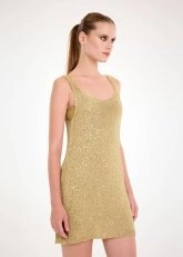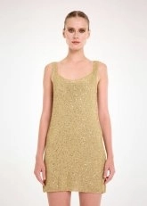 Triko konforunu feminen şıklıkla buluşturan simli altın pullu mini örgü elbiseyi keşfedin. Kendi ışıltısını stiline yansıtmayı seven Knitss kadınları için üretilen simli kolsuz mini gold elbise, örgü astarı ve rahat kalıbı ile konforu ön planda tutan şıklık sunar. Özel pullu triko kumaşı, zarif işçilği, çağdaş stili ve zamansız şıklığı ile her kadının kalp atışlarını arttıracak aura’sı yüksek bir parçadır.