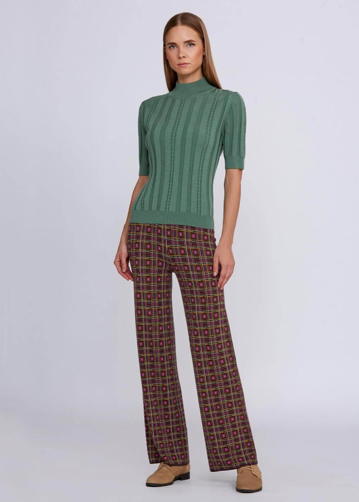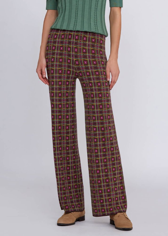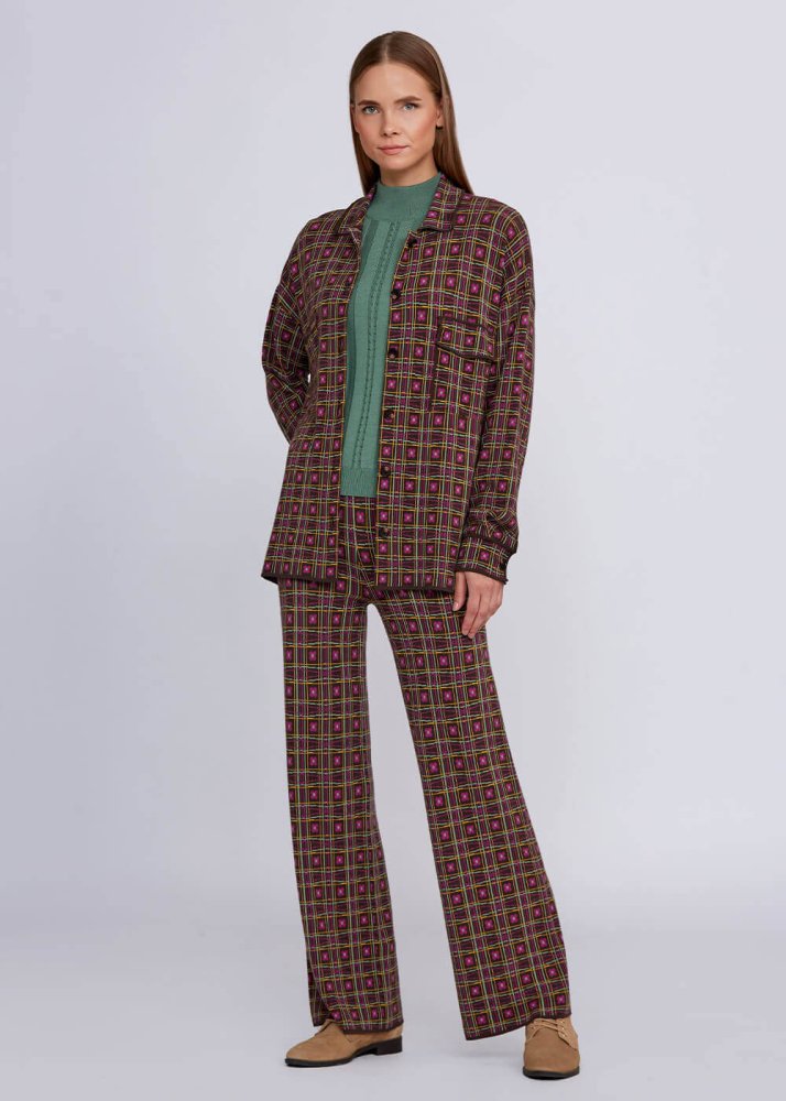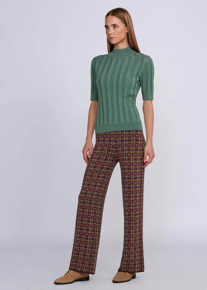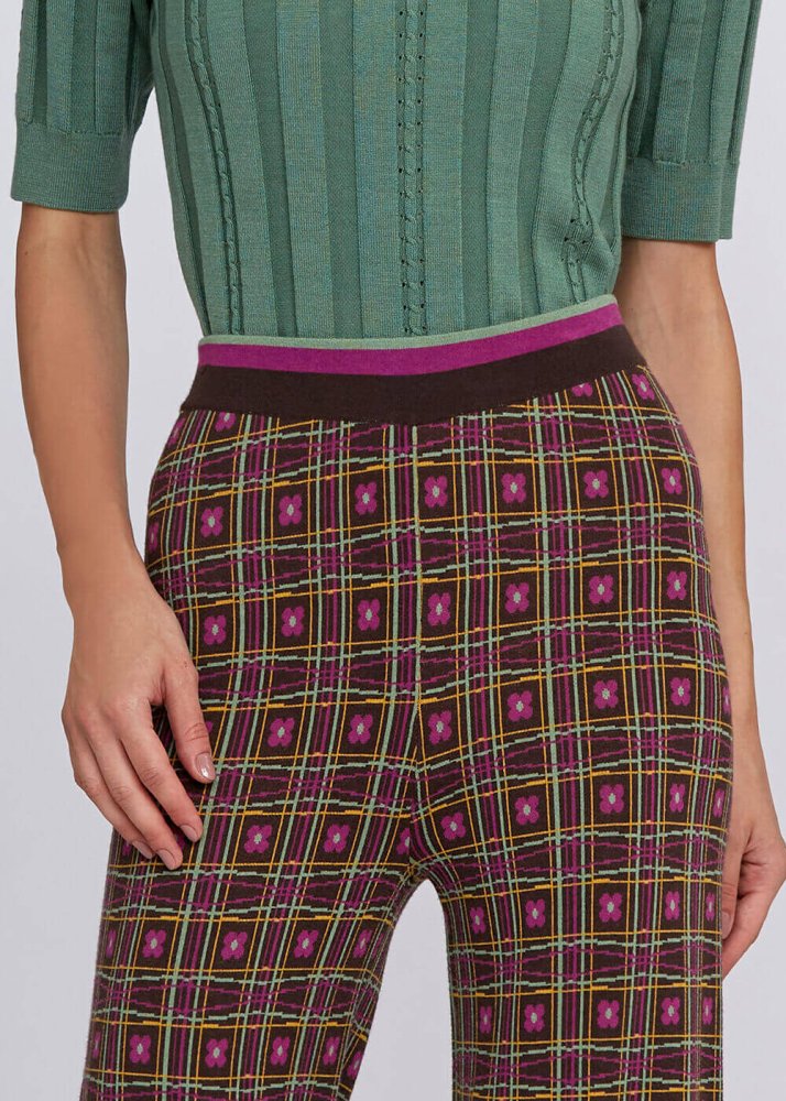 Rahat düz kesim kalıbı ve belden renkli lastik detayı sayesinde konforlu bir giyim deneyimi sunan Jakar desenli triko pantolon, kışlık gardırobunuzun favori kombin tamamlayıcı parçalar arasında yerini alacaktır. Koleksiyonda yer alan diğer parçalarla kolaylıkla kombinleyebilrceğiniz kadın triko pantolon modeli, business ve hafta sonu stiliniz için idealdir.