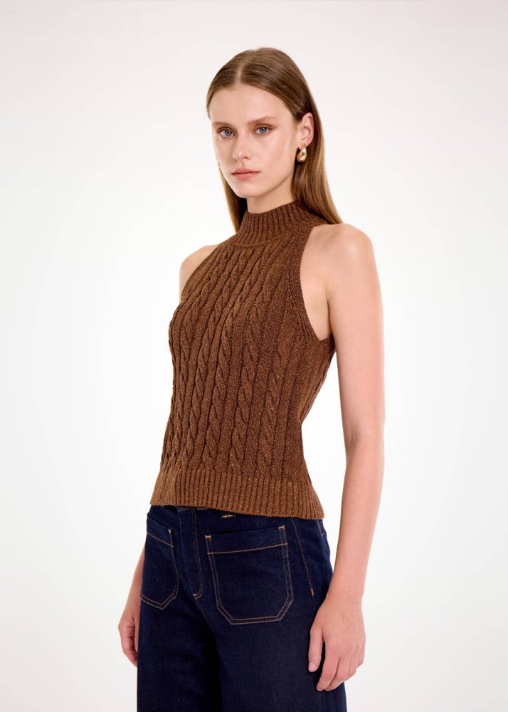 Kahve Işıltı Saç Örgü Triko Üst