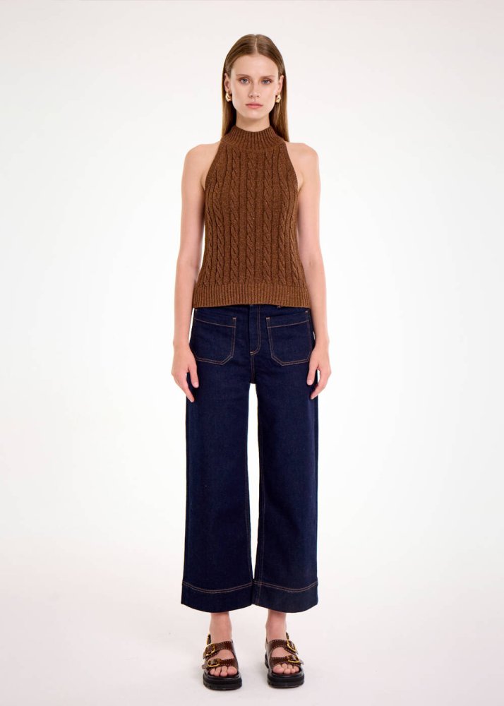 Simli kahverengi saç örgüsü desenli trikosu ile ilk görüşte fark yaratan kolsuz boğazlı kazak, kendi ışıltısını stiline yansıtan Knitss kadınlarından ilhamla tasarlandı. Rahat kalıbı ve pamuk karışımlı İtalyan ipliklerinden oluşan sürdürülebilir elyaf içeriği ile doğaya uyumlu giyimin temsilcisi kolsuz boğazlı kahverengi triko, şık feminen stili ile zamansız bir parçadır.
