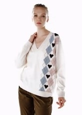 Aşkın ve zarafetin sembolü olan kalpli intersia desen triko, ekru rengiyle sade ama etkileyici bir duruş sergiliyor. Kalp desenleriyle hareket kazanan tasarım, feminenliği ön plana çıkarırken yumuşak dokusuyla konforu da elden bırakmıyor. V yaka detayı, boyun hattını zarifçe vurgulayarak modern bir siluet yaratıyor. İtalyan ipliğiyle özenle örülen bu triko, romantik ruhu gardırobuna taşımak isteyen kadınlar için ideal.