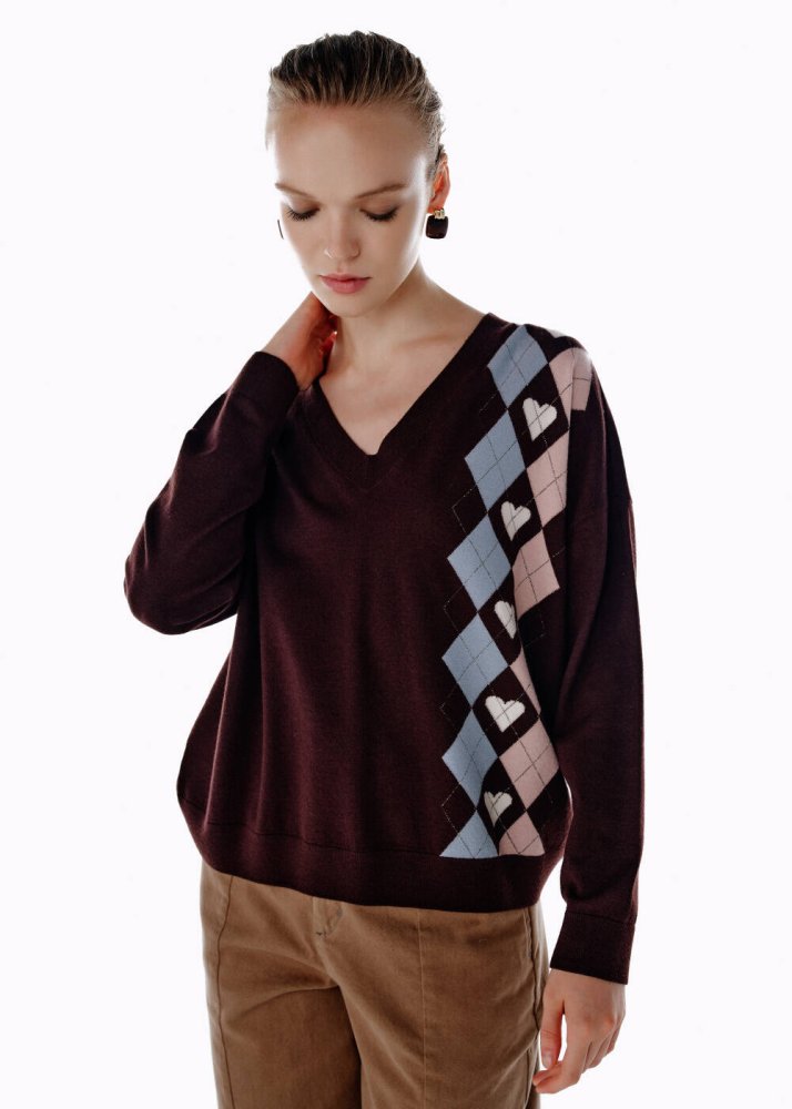 Sıcacık koyu kahverengi tonu ve romantik kalp desenleriyle kalpli intersia desen triko, klasik Knitss zarafetini duygusal bir ifade biçimine dönüştürüyor. V yaka formu modern bir dokunuş sağlarken, ince dokulu İtalyan ipliğiyle örülen kumaş, cilde yumuşacık bir his verir. Feminen detaylarıyla dikkat çeken bu triko, hem şehirde hem hafta sonu kaçamaklarında stil sahibi bir rahatlık sunar.