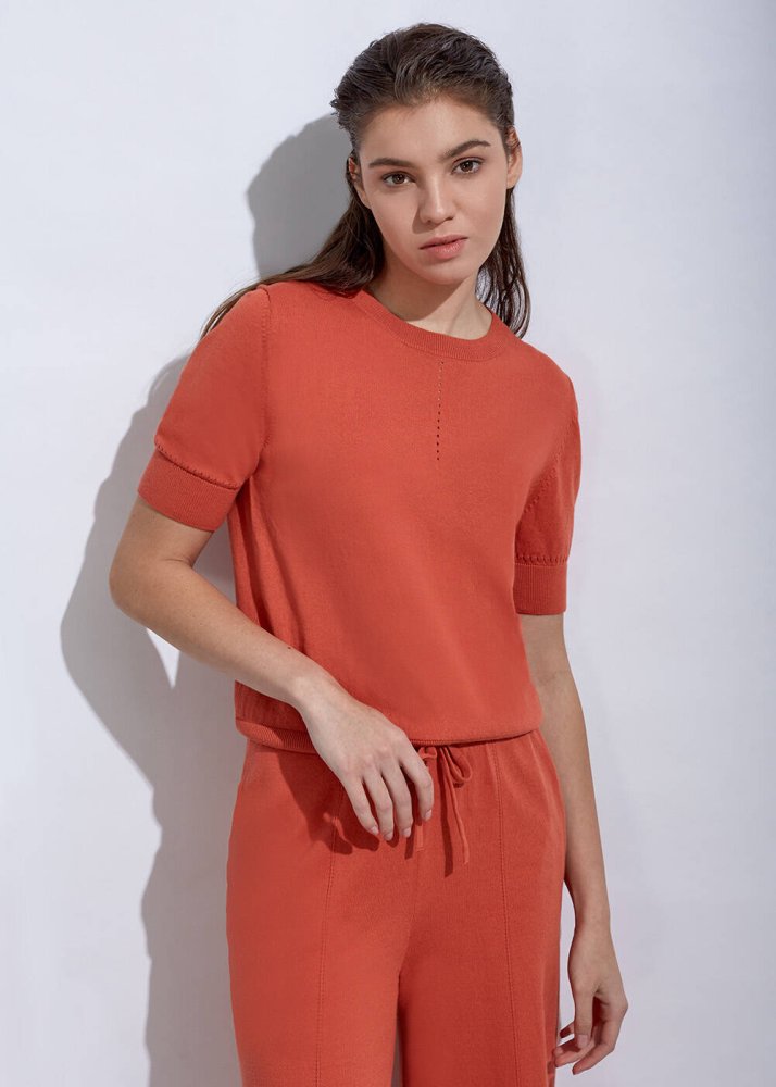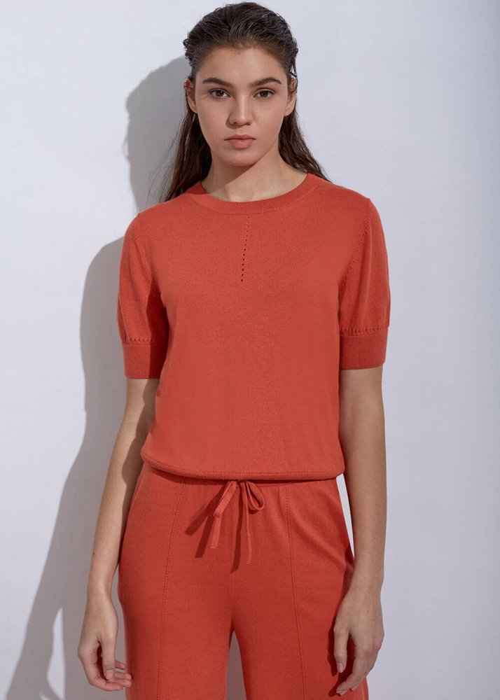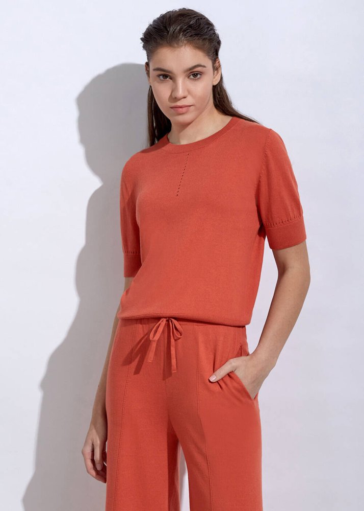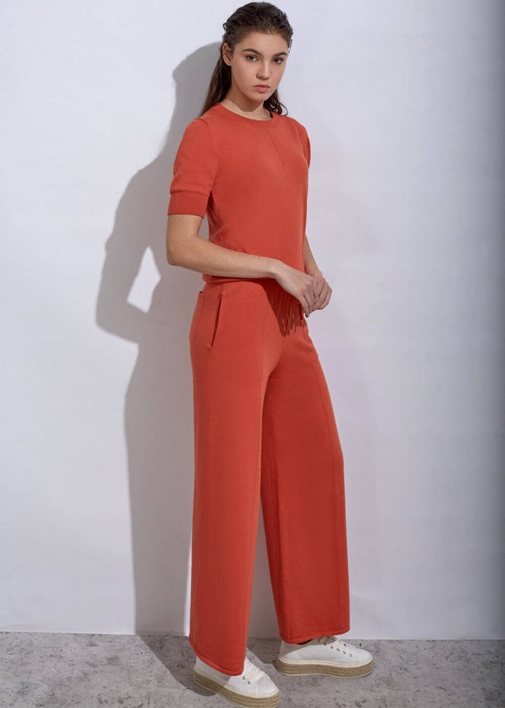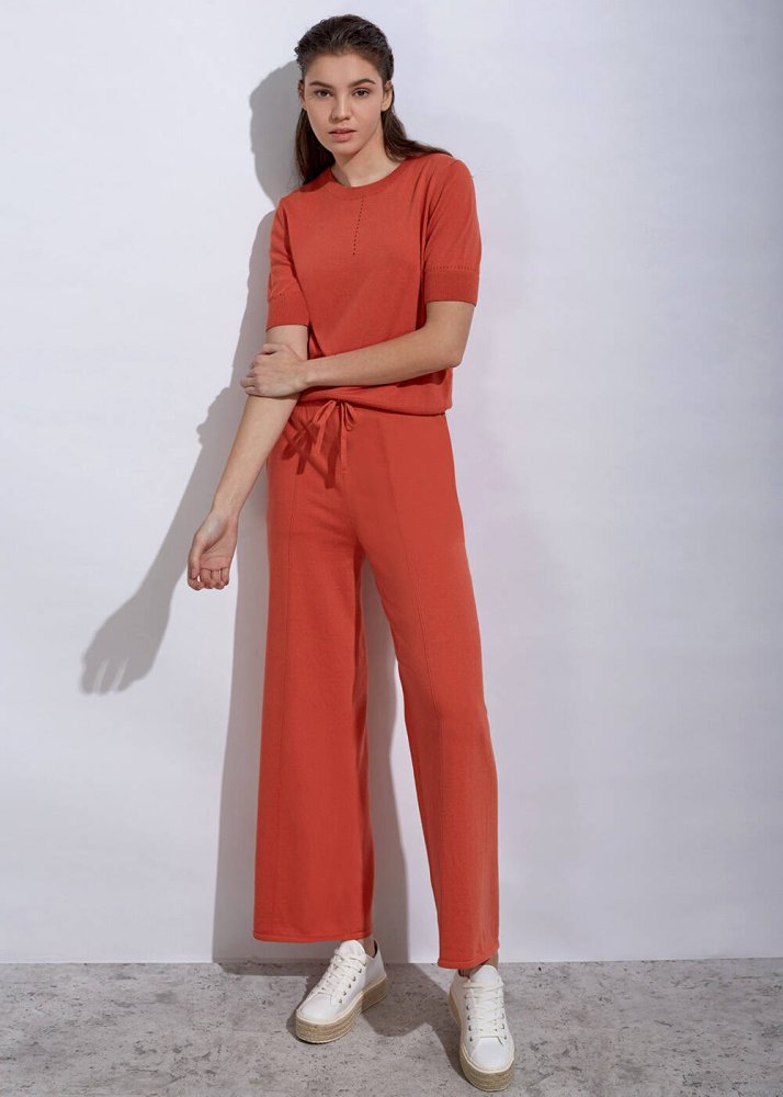 Ajur örgü detaylı triko üst, içerdiği kaşmir karışımı sayesinde yumuşak bir yapıya ve uzun kullanım ömrüne sahiptir. Turuncu triko üst modeli, yaka ve kollarında ajur örgü detay stilinize sportif bir tarz katmaktadır. Takımı olan Angel Pants ile kombinleyebileceğiniz triko üstü, koleksiyonun diğer parçaları ile de giyebilirsiniz.