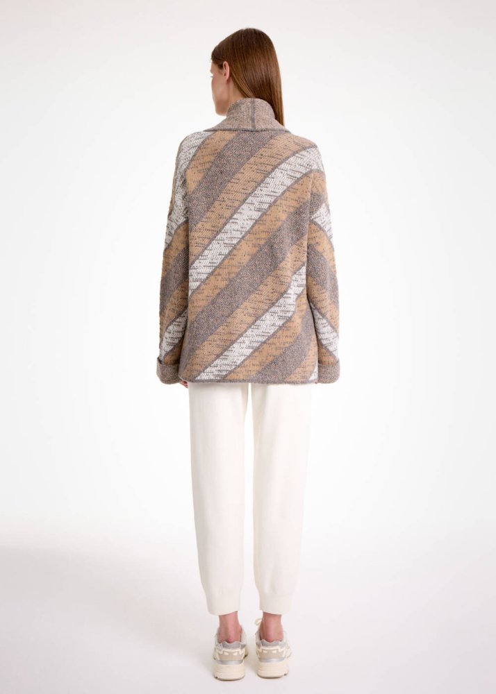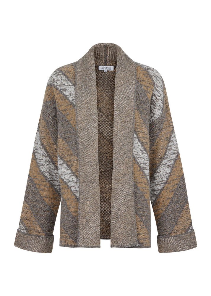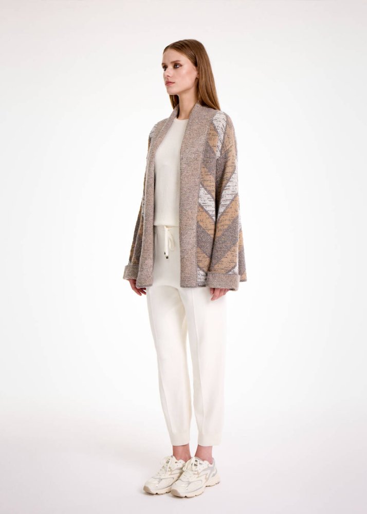 Özel örgü deseni ve pastel tonlardaki renk kombinasyonu ile Knitss’e özgü şık stilini ilk bakışta belli eden camel-gri triko hırka, kaşmir karışımlı geri dönüştürülmüş İtalyan elyaf içeriği ile sürdürülebilir modanın şık bir temsilcisidir. Sim detaylı camel-gri triko hırka, hem ofis hem günlük kombinleriniz için değerli bir yatırımdır.