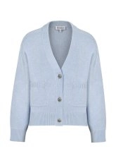 Sürdürülebilir moda ilkelerince kaşmir ve geri dönüştürülmüş elyaflarla üretilen buz mavisi düğmeli hırka; zarif mücevher düğmeleri, kollardaki yırtmaç detayları ve fonksiyonel cepleri ile zamansız şıklıktadır. Yumuşak dokusunu kaşmirin kendine has yapısından alan buz mavisi triko hırka, günlük ve şık kombinlere zahmetsizce uyum sağlar.