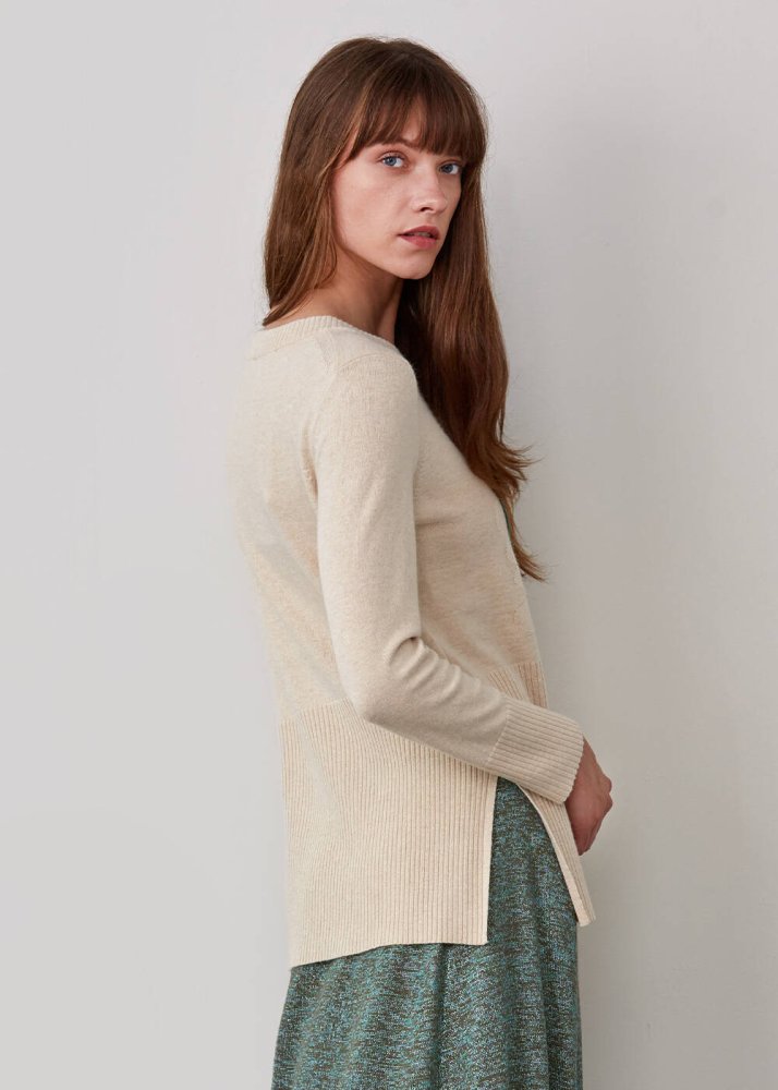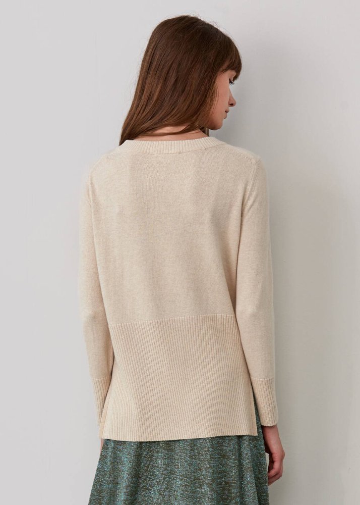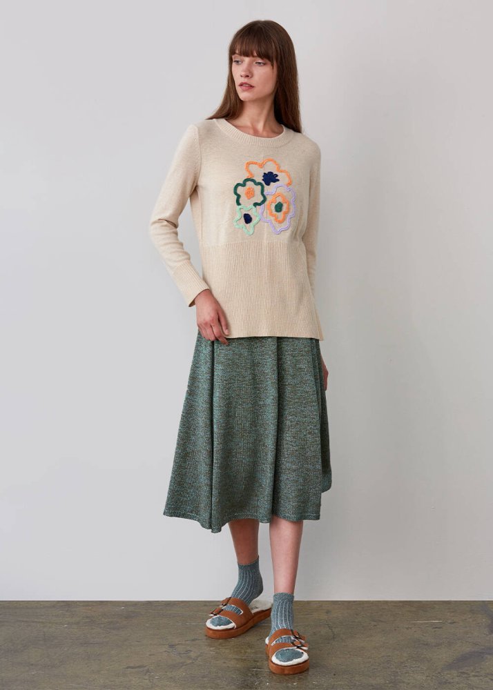 Kaşmir karışımlı bej triko kazak, LENZING ECOVERO markalı viskon elyafı ve Global Recycled Standard sertifikalı geri dönüştürülmüş elyaflardan üretilmiştir. Bisiklet yaka triko kazak, çiçek nakış işlemesine ve rahat bir kalıba sahiptir. Koleksiyonun Mix&Match özelliği ile diğer parçalar ile kolay kombinleyebilirsiniz.