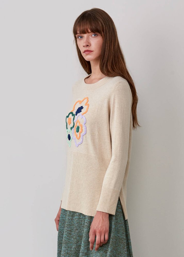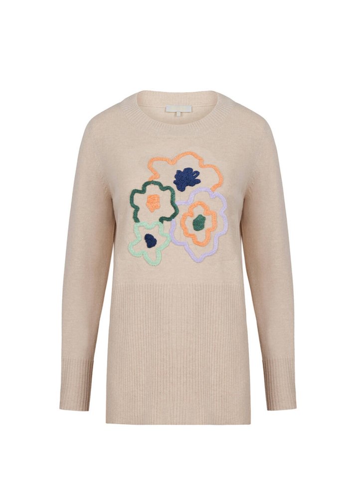 Kaşmir Karışımlı Çiçek İşlemeli Bej Triko Kazak