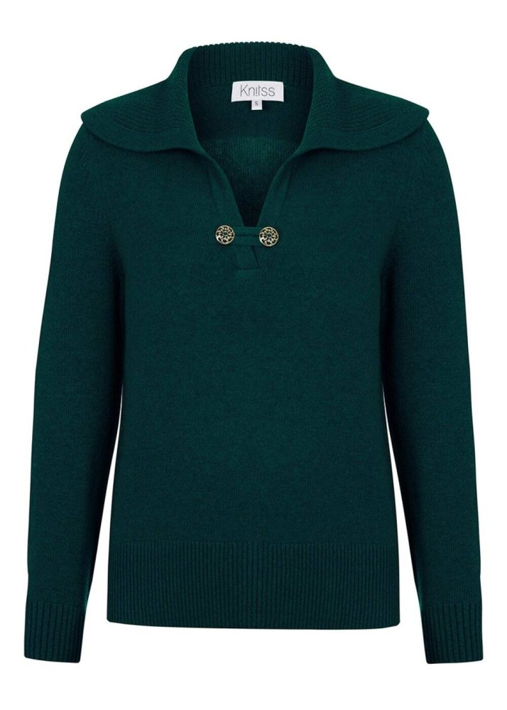 Minimal şıklığını zarif detaylarla sofistikeleştiren Knitss kadını için üretilen yeşil kazak, düğme detaylı geniş yaka modeli ile çok şıktır. Çevre dostu sertifikalı geri dönüştürülmüş İtalyan iplikleri ve kaşmirden üretilen yeşil triko kazak, yumuşak dokusu ve benzersiz pürüzsüzlüğü ile her giyişte keyifli bir giyim deneyimi yaşatır.