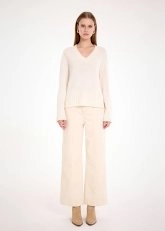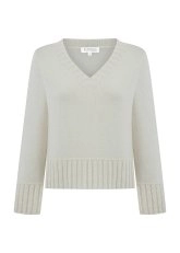 V yaka ekru kazak, kaşmirli geri dönüştürülmüş İtalyan iplik karışımlı sürdürülebilir içeriği ve farklı tarzlardaki kombinlere kolayca uyum sağlayan kullanışlı modeli ile bu kış favori parçalarınızdan olmaya adaydır. Rahat kalıbı ve kaşmirin sağladığı yumuşak tuşesi ve terletmeden ısıtan yapısı ile çok konforludur. Kollardaki ve yakadaki zarif örgü detayı ile çok şıktır.