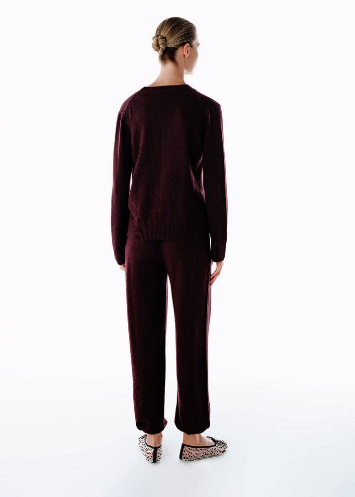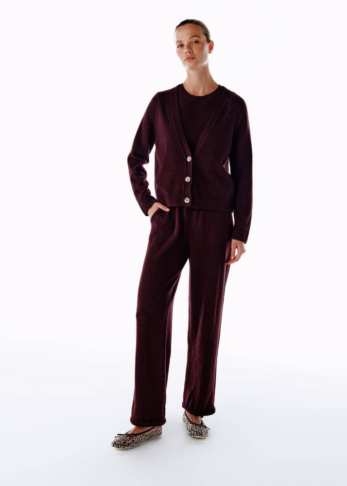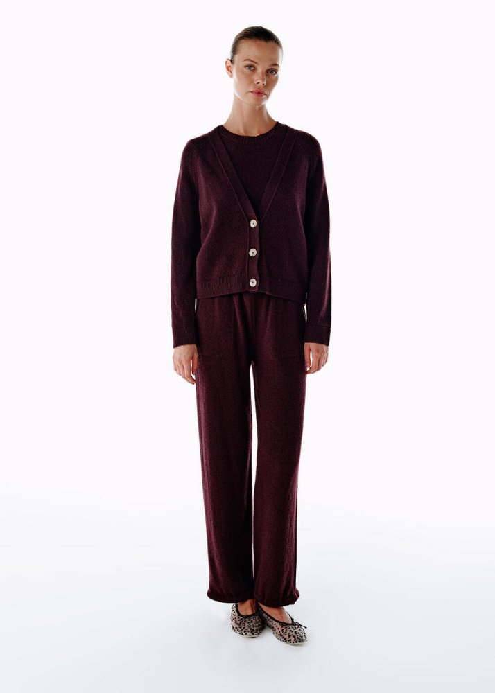 Kaşmir triko pantolon, mürdümün derin ve sıcak tonuyla zarif bir duruş kazanıyor. %95 kaşmir ve %5 yün karışımıyla vücuda hafifçe oturur, tenle buluşan yumuşaklığıyla konforu lüks bir deneyime dönüştürür. Beli bağcıklı formu ve ayarlanabilir büzgülü paçaları, günlük stile rahat bir dinamizm kazandırırken ajur örgü detayları tasarıma zarif bir dokunuş katar. Şık bir triko üst veya bir hırkayla kombinlendiğinde, güçlü bir Knitss görünümü sunar.