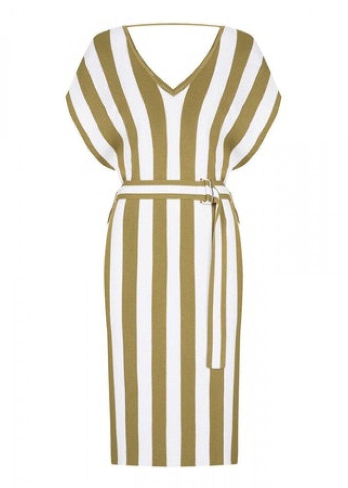 Kemerli Haki Beyaz Uzun Triko Elbise